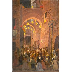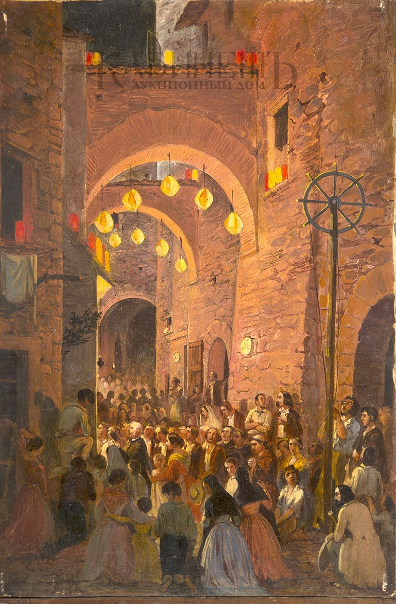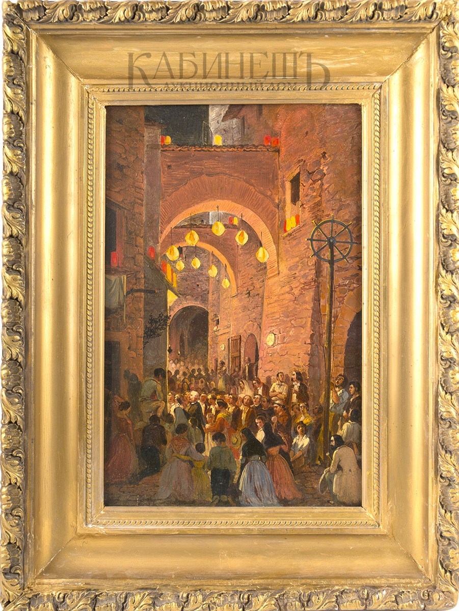 По всей вероятности, на картине изображено празднование католического праздника «Феррагосто», о чем свидетельствуют литеры «М.М.» («Madre Maria») под короной на щитах, украшающих дома. Праздник «Феррагосто» (Успение Богородицы) отмечается в Италии 15 августа.