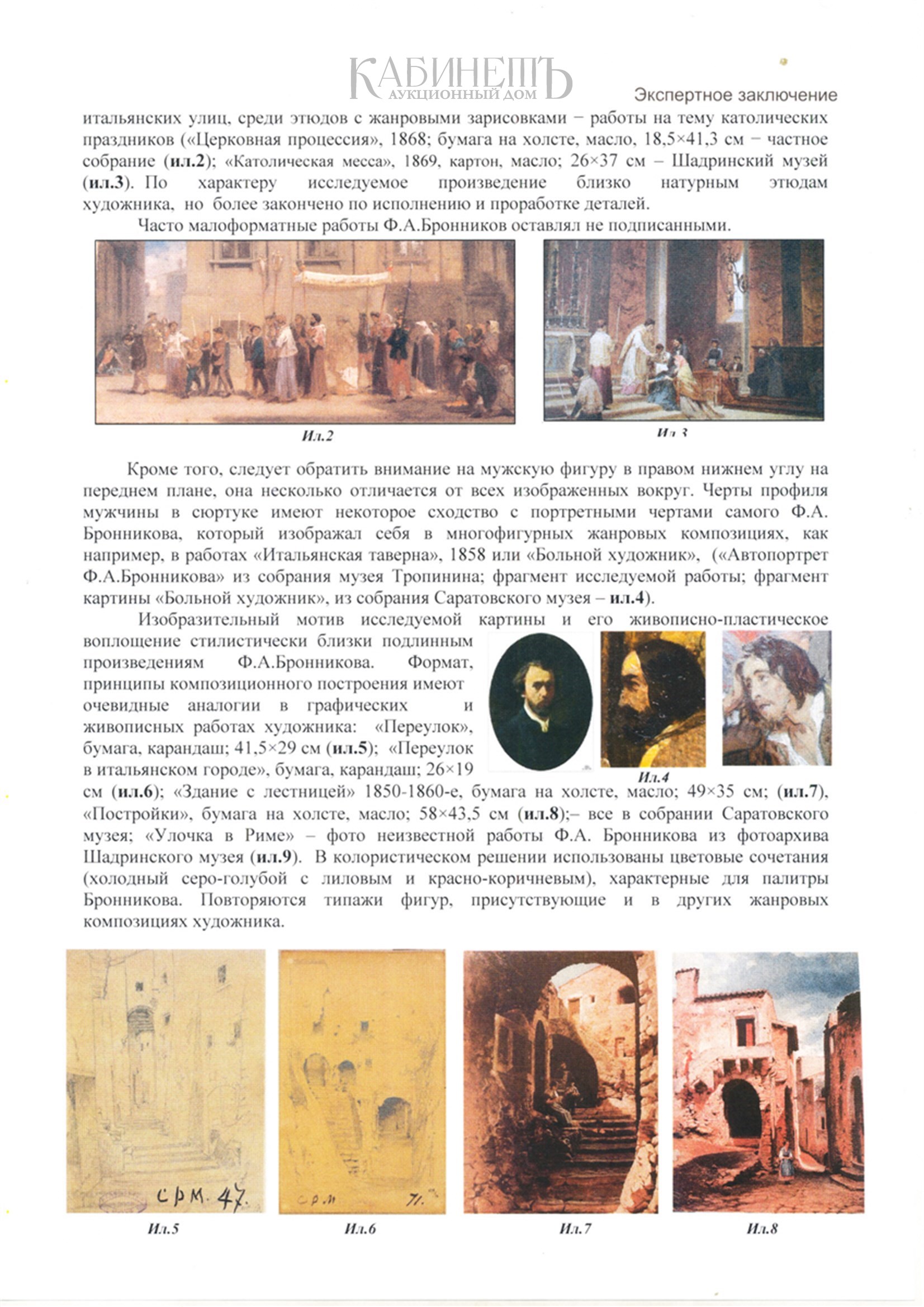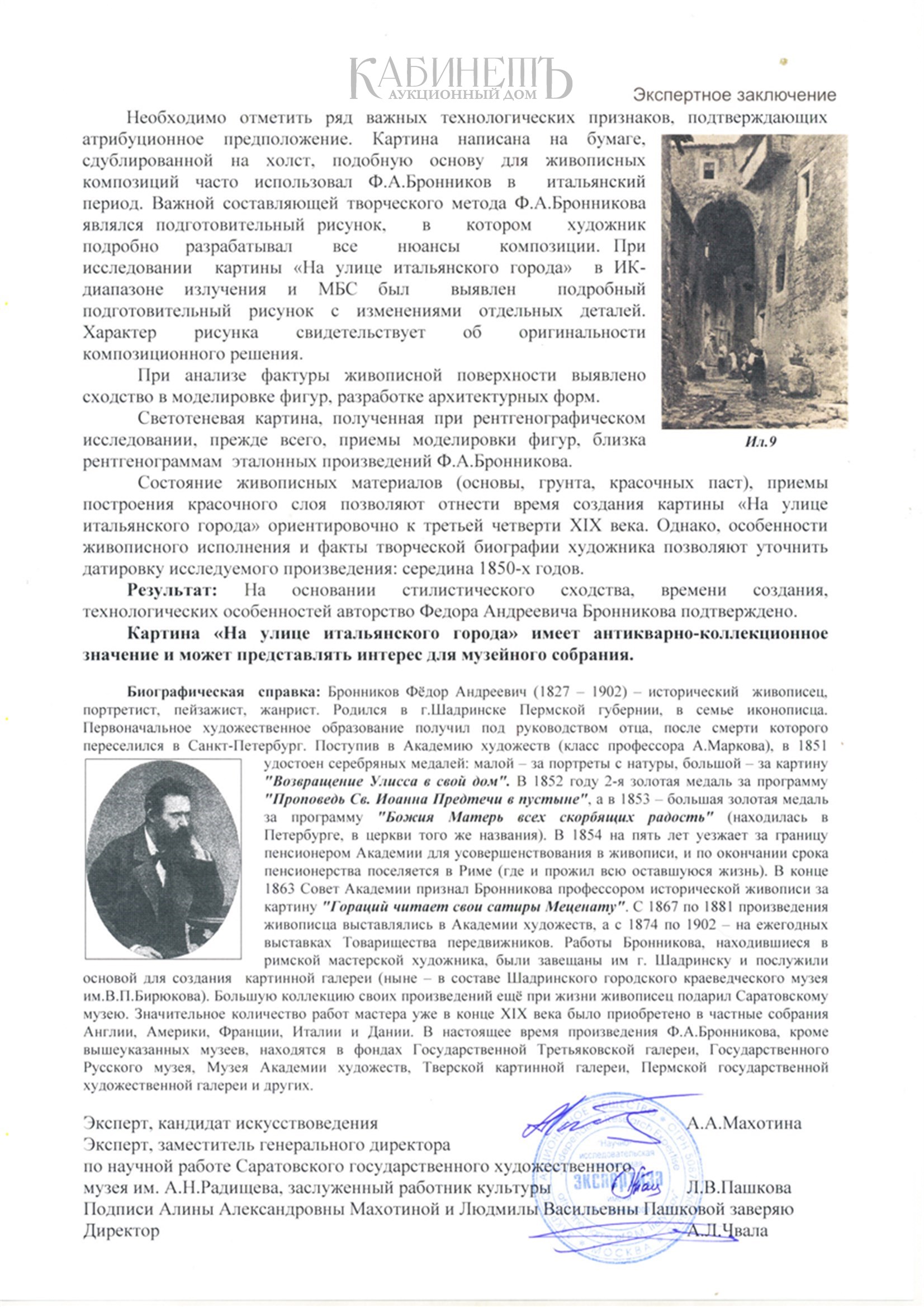 Бронников Федор Андреевич (1827–1902) – исторический живописец, портретист, пейзажист, жанрист. Сын иконописца. Учился в граверной мастерской ксилографа Е.Е. Бернардского, затем был вольнослушателем ИАХ. С 1850 г. – ученик профессора исторической живописи А.Т. Маркова. В 1854 г. получил звание художника 1-й степени и был отправлен в пенсионерскую поездку в Италию. По окончании срока пенсионерства поселился в Риме. В 1863 г. получил звание профессора исторической живописи. В 1867–1881 гг. экспонировал рабаты на академических выставках, в 1874–1902 гг. – на выставках ТВПХ. Бронников был награждён орденом Святой Анны 3-й степени. Произведения хранятся в собраниях Шадринского краеведческого музея, Саратовского ХМ им. А.П. Радищева, ГТГ, ГРМ, Музея АХ, Тверской КГ, Пермской КГ и др.