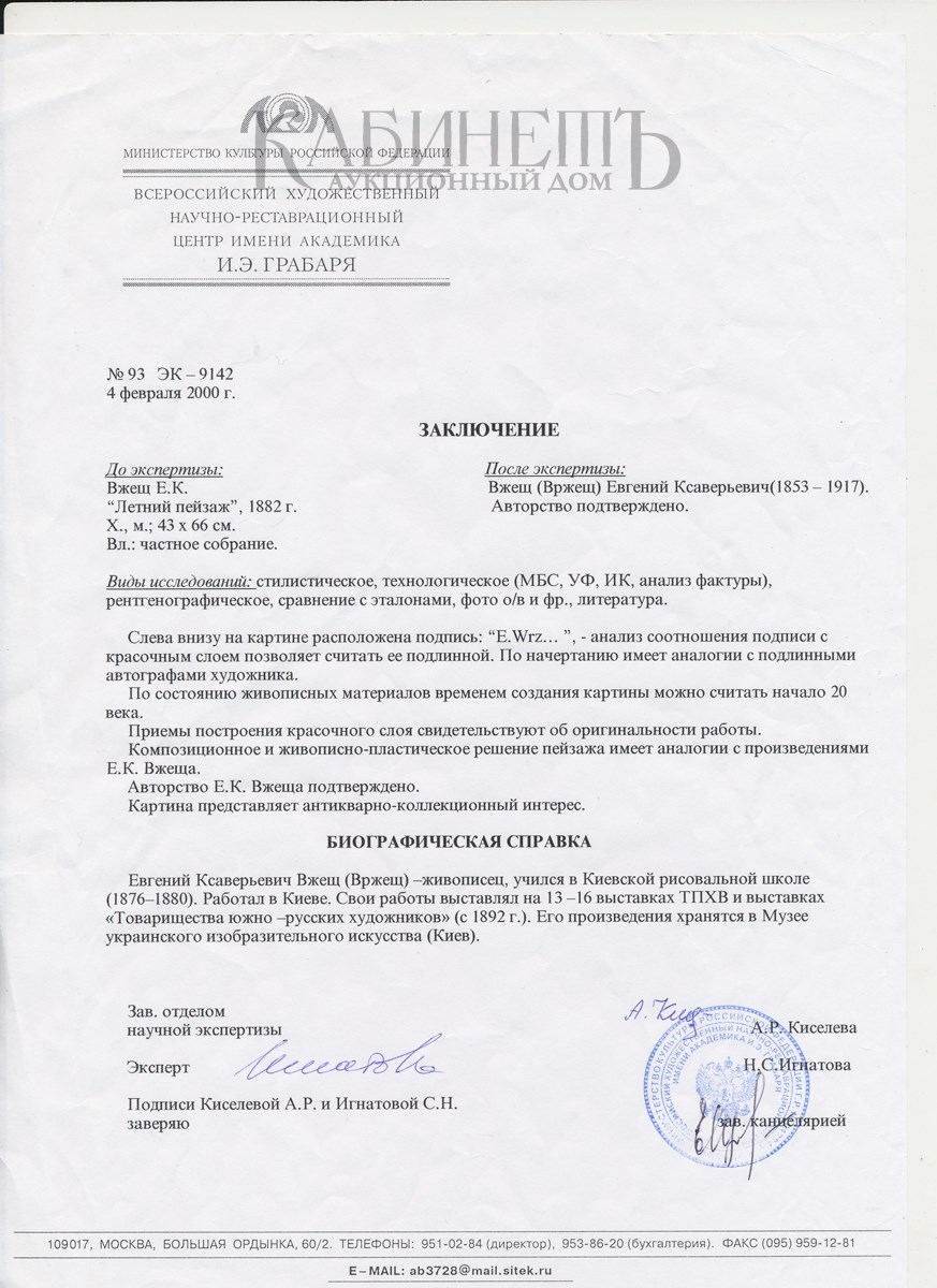 Экспертное заключение ВХНРЦ им. И.Э. Грабаря от 4 февраля 2000 г.