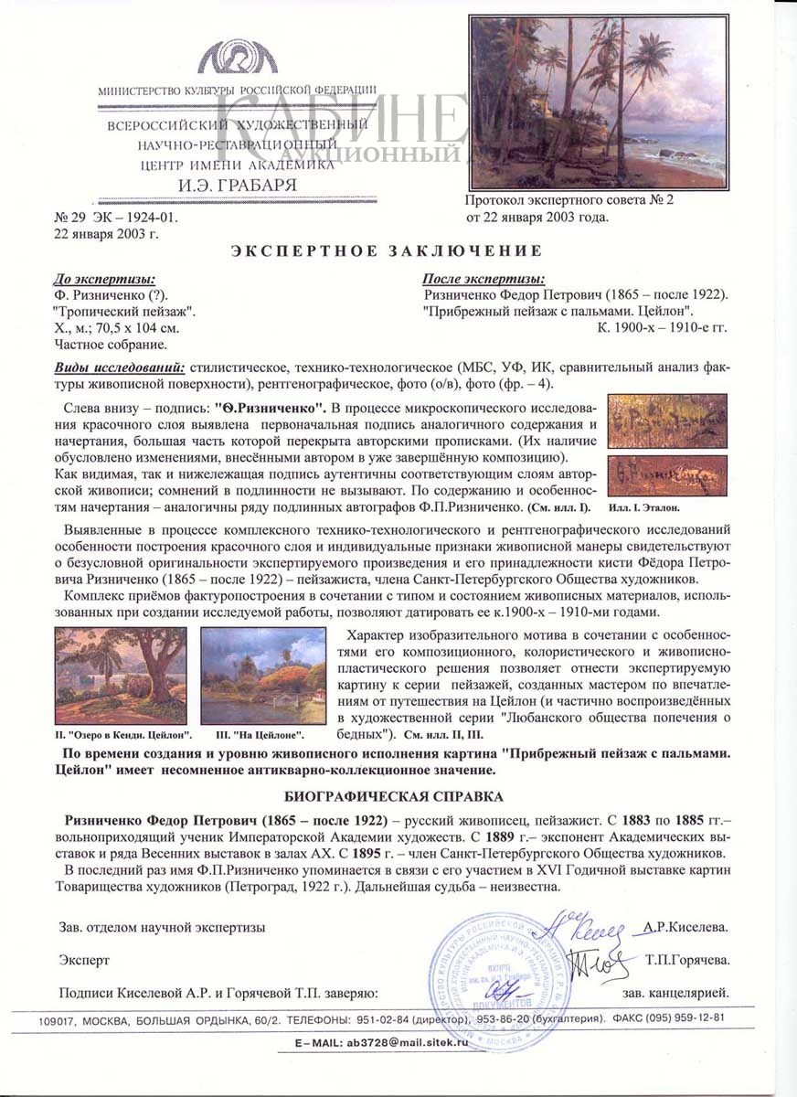 Экспертное заключение ВХНРЦ им. И.Э. Грабаря от 22.01.2003 г.