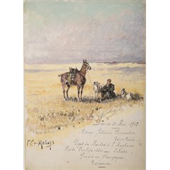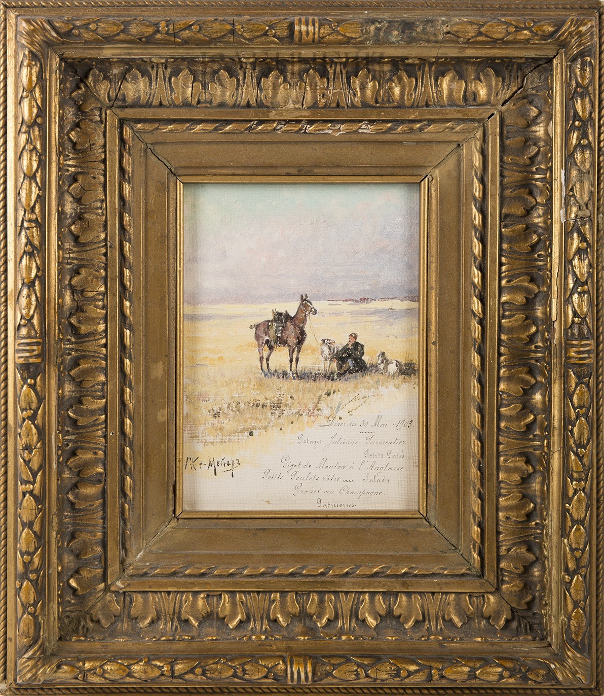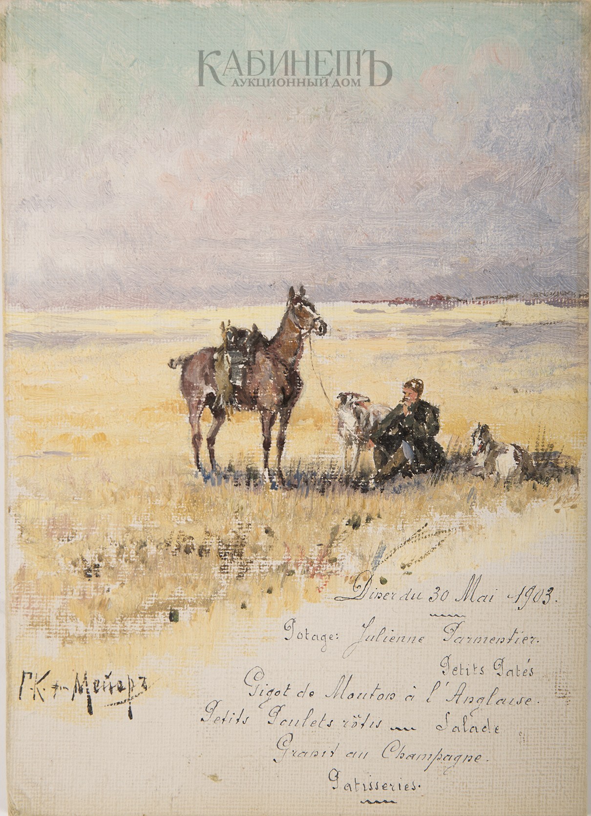 Мейер фон, Георгий Константинович (1853 – после 1917) – живописец, генерал русской армии. Живописью занимался самостоятельно. Особое внимание уделял охотничьим зарисовкам, которые печатались в специализированных журналах для охотников. На выставках имели успех написанные Мейером портреты породистых собак. Известно, что он принимал активное участие в работе по выведению чистопородных русских борзых, которая велась под руководством великого князя Николая Николаевича (младшего). Создал «Портрет псовой борзой, охоты Великого князя Николая Николаевича». В 1902 г. по распоряжению военного министра был командирован в Болгарию, где преподнёс князю Болгарскому Фердинанду свою картину «Атака киевских гусар под Нова-Загорой», посвящённую событиям русско-турецкой войны 1877–1878 гг. В 1908 г. вышел в отставку. Стал членом-учредителем Общества художников-киевлян. Во время Первой мировой войны киевское издательство «Рассвет» выпустило серию открыток по рисункам генерала Г.К. Мейера, изображающим сцены военной жизни. После революции 1917 г. эмигрировал во Францию.