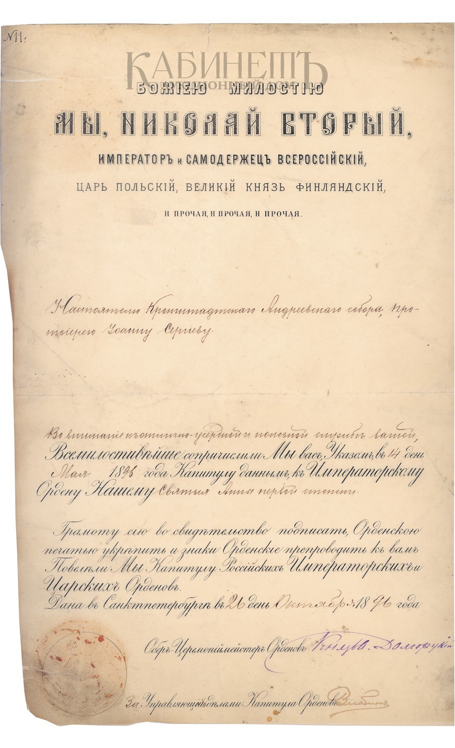 Грамота о сопричислении ордену Святой Анны 1-й степени настоятеля Кронштадтского Андреевского собора, протоирея Иоанна Сергиева 16 октября 1896 года.