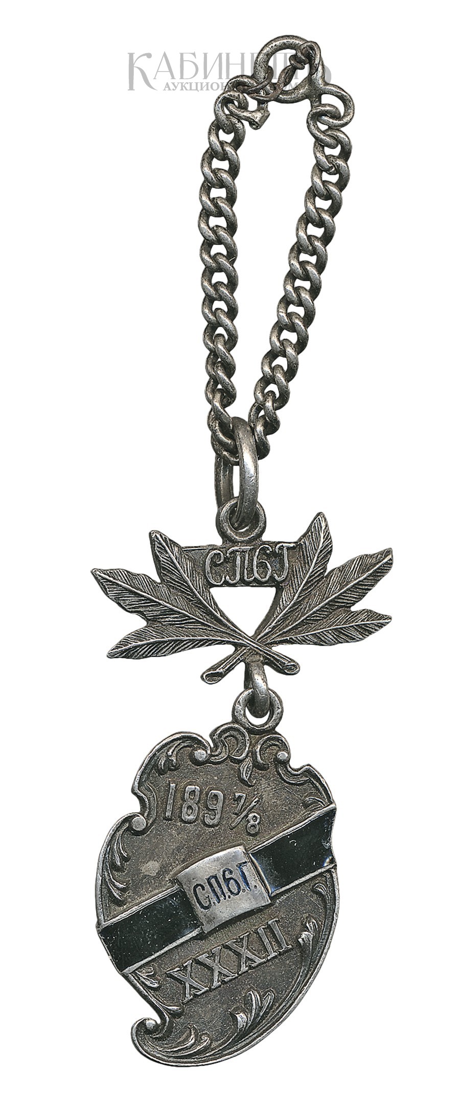 Российская Империя. Частная мастерская. 1897–1898 гг.Размер 39 х 21 мм. Вес 8,21 г. Серебро, эмаль.На обратной стороне гравированная надпись: «Е.В./ Бобинъ».