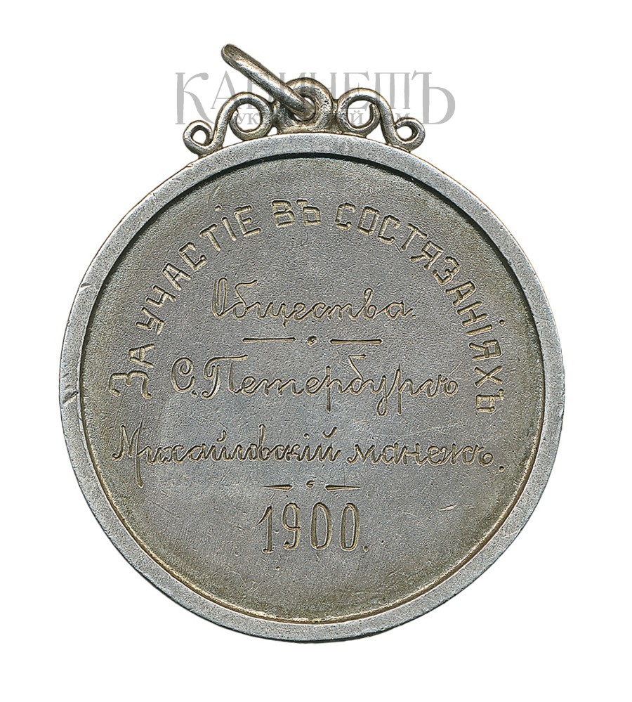 На оборотной стороне – гравированная надпись: «За участiе въ состязанiях/ общества. / С.-Петербургъ /Михайловскiй манежъ /1900.»