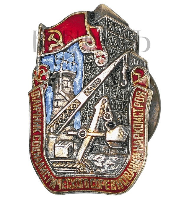 Значок «Отличника социалистического соревнования Наркомстроя» - ведомственный знак отличия Народного комиссариата по строительству СССР (образован 29 мая 1939 г.; упразднен 19 января 1946 г.; на его базе образованы НК по строительству предприятий тяжелой индустрии СССР, НК по строительству военных и военно-морских предприятий СССР и НК по строительству топливных предприятий СССР). Положение о знаке было утверждено Народным комиссаром по строительству С.З.Гинсбургом 26 декабря 1939 г.