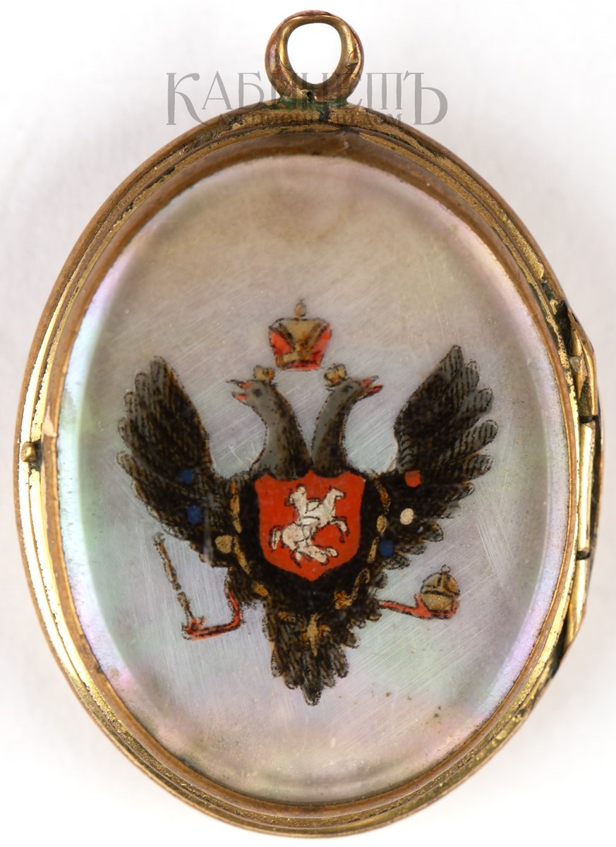 Российская империя, частная мастерскаяВторая половина XIX в.Размер 3 х 2 смВес 4,96 гЖелтый металл, перламутр, роспись по перламутру
