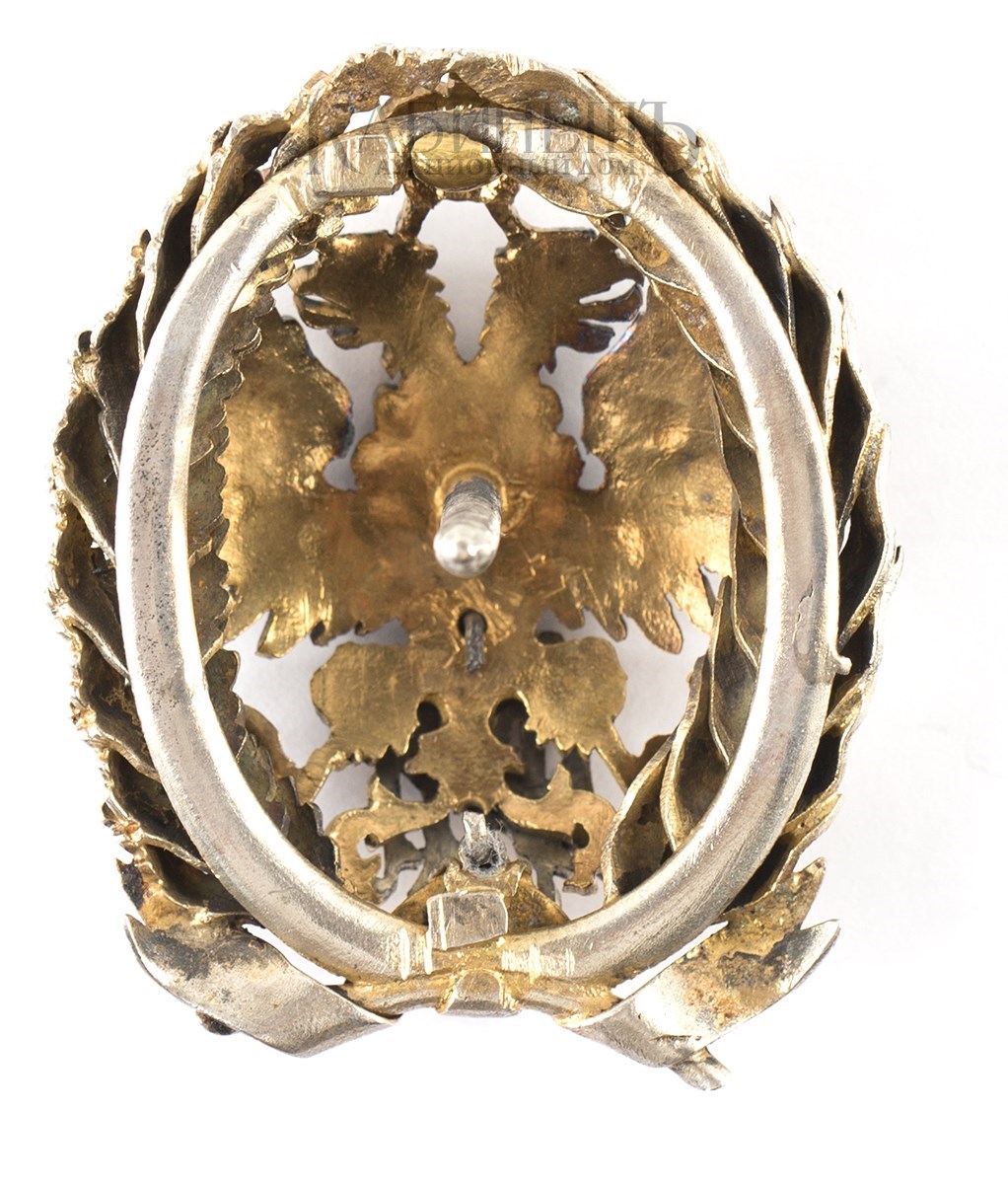 Клейма: на лицевой стороне на лентах венка – пробирное «84» с женской головкой в кокошнике, повернутой вправо и буквой «дзета»; советское удостоверяющее клеймо 875 пробы.