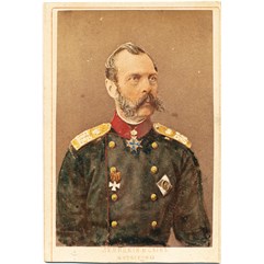 Император изображен в сюртуке с погонами с вензелем отца, императора Николая I, со знаками орденов Святого Георгия 4-й степени и Pour le Mеrite, а также со звездой ордена Святого Георгия.