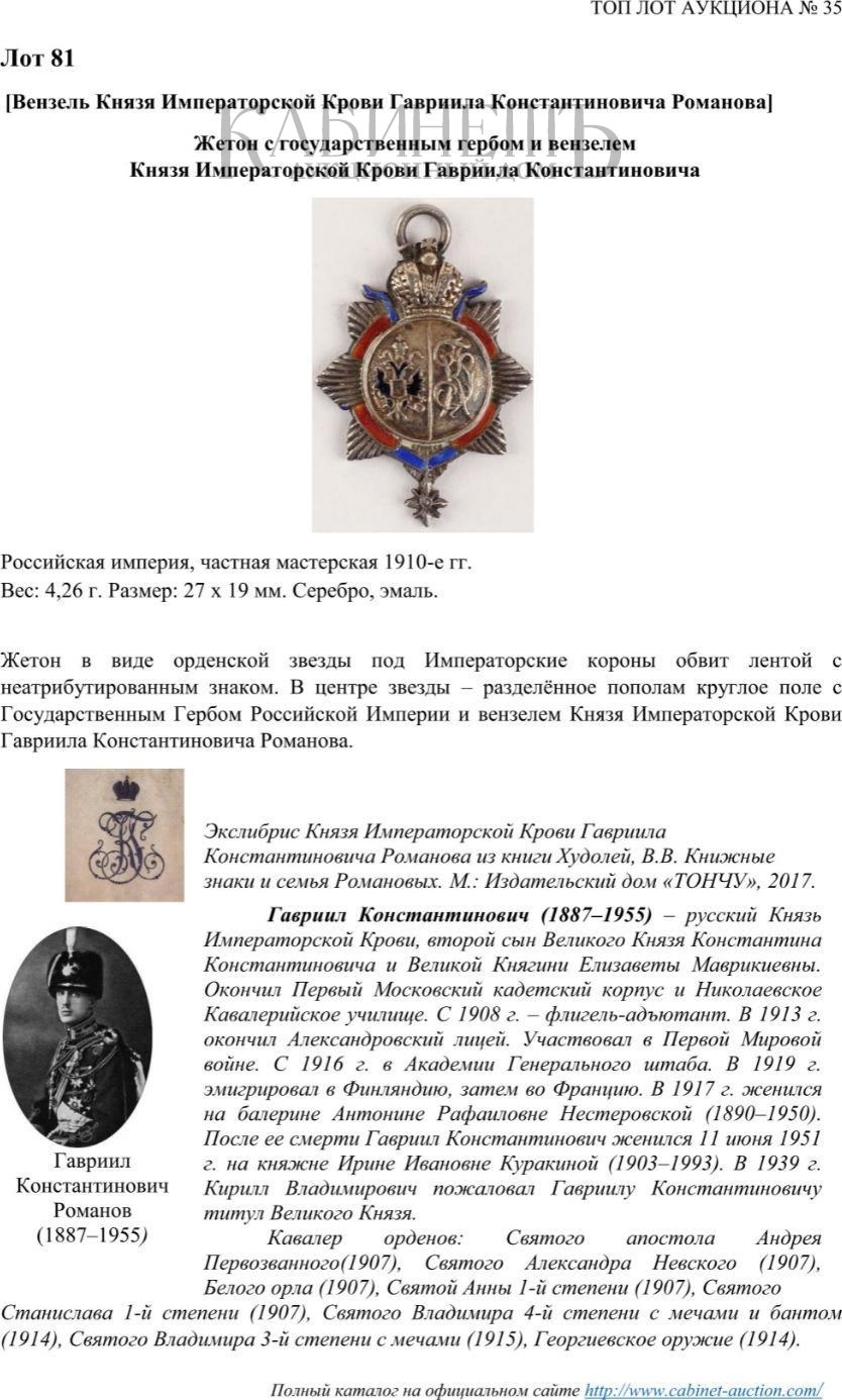 Гавриил Константинович (1887–1955) – русский Князь Императорской Крови, второй сын Великого Князя Константина Константиновича и Великой Княгини Елизаветы Маврикиевны. Окончил Первый Московский кадетский корпус и Николаевское Кавалерийское училище. С 1908 г. – флигель-адъютант. В 1913 г. окончил Александровский лицей. Участвовал в Первой Мировой войне. С 1916 г. в Академии Генерального штаба. В 1919 г. эмигрировал в Финляндию, затем во Францию. В 1917 г. женился на балерине Антонине Рафаиловне Нестеровской (1890–1950), получившей в 1926 г. от Великого Князя Кирилла Владимировича, провозглашенного Российским императором, титул княгини Стрельнинской, а в 1935 г. – светлейшей княгини Романовской-Стрельнинской. После ее смерти Гавриил Константинович женился 11 июня 1951 г. на княжне Ирине Ивановне Куракиной (1903–1993). В том же году ей был пожалован титул светлейшей княгини Романовской-Куракиной. В 1939 г. Кирилл Владимирович пожаловал Гавриилу Константиновичу титул Великого Князя. Кавалер орденов: Святого апостола Андрея Первозванного(1907), Святого Александра Невского (1907), Белого орла (1907), Святой Анны 1-й степени (1907), Святого Станислава 1-й степени (1907), Святого Владимира 4-й степени с мечами и бантом (1914), Святого Владимира 3-й степени с мечами (1915), Георгиевское оружие (1914).