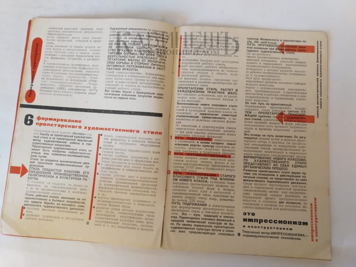 Сборник-манифест Объединения новых видов художественного труда "Октябрь" (основано в 1928 г., среди членов А.А. и В.А.Веснины, А.М.Ган, М.Я.Гинзбург, А.А.Дейнека, Г.Г.Клуцис, А.И.Курелла, И.Л.Маца, А.И.Михайлов, Д.С.Моор, П.М.Новицкий, В.С.Тоот, кинорежиссер Сергея Эйзенштейн, художники-монументалисты Диего Риверы и Бела Уитца и др.). Оформили книгу члены "Октября" т.т. С.Б.Телингатер, Э.Гутнов, Н.Спиров. Объединение “Октябрь” представляется целесообразным рассматривать в контексте творческих исканий (не только изобразительного искусства, но и литературы, театра, кино, архитектуры) лефовского, пролеткультовского, производственно-вещного и художественно-конструктивистского движений при всем различии каждого из них в отдельности. Позиции “октябристов”: искусство должно иметь четкую классовую пролетарскую направленность в условиях НЭП(а), хозяйственно-экономической перестройки, появления новой буржуазии и усиления классовой борьбы. Лозунг объединения - “открытая классовая борьба” со всеми известными буржуазными группами и объединениями при “известном сотрудничестве” с так называемыми “попутчиками”. “Октябрь” охватил в профессиональном отношении живописцев, прикладников, искусствоведов, киномастеров, драматургов и т.д. с главной целью - “содействовать развитию классовых пролетарских течений в области пространственных искусств”. Часто на выставках “Октября” в СССР и в Германии свои произведения экспонировали родственные ему мастера - Эль Лисицкий, А.М.Родченко, А.Н.Самохвалов, В.Ф.Степанова и др. К весне 1932 года “Октябрь” разделит судьбу всех остальных творческих объединений.