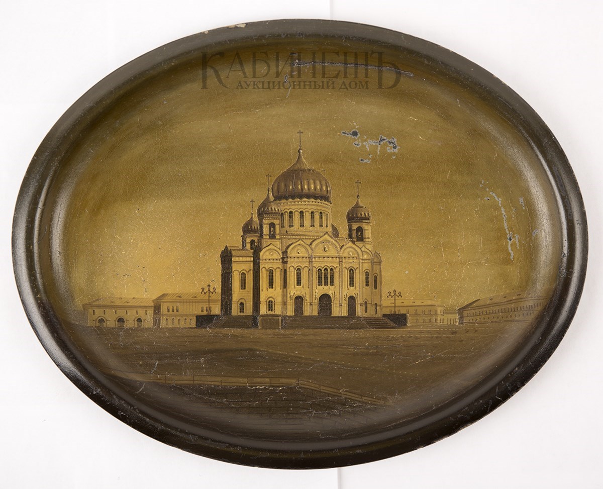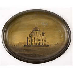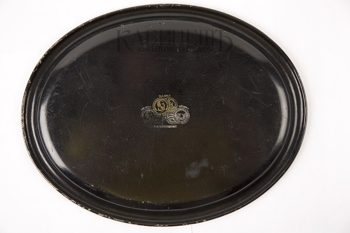 Повреждения красочного слоя, два сквозных отверстия в верхней части подноса.
