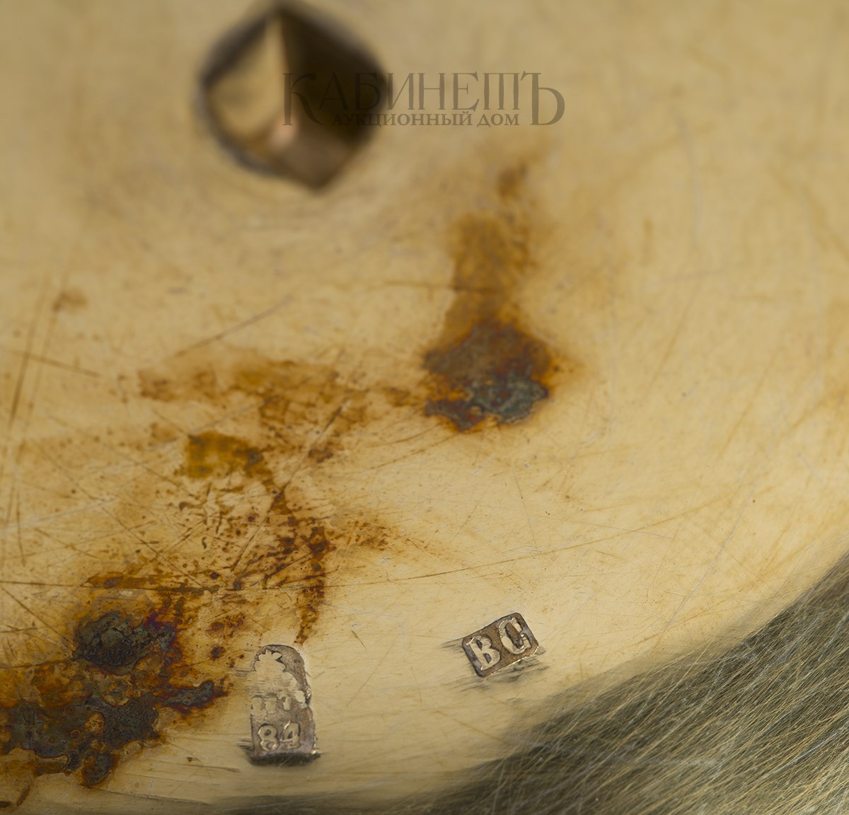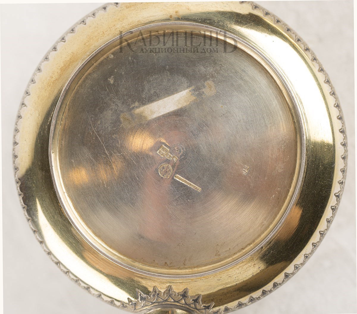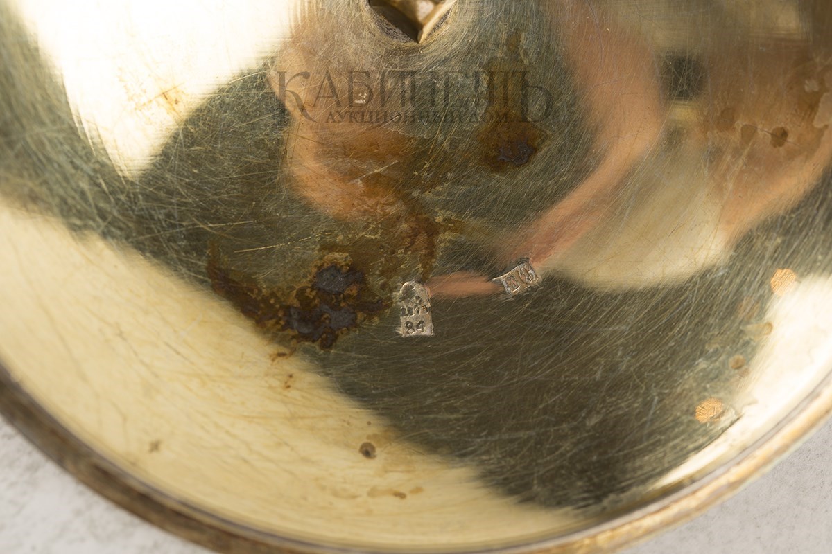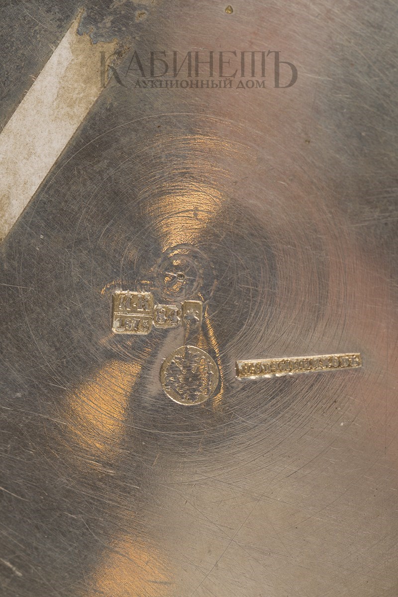 Клейма: пробирное «84» с гербом Москвы, клеймо пробирного мастера «ИК» над годом «1875», развернутое клеймо «Овчинниковъ» с императорским орлом, именник «ВС».
