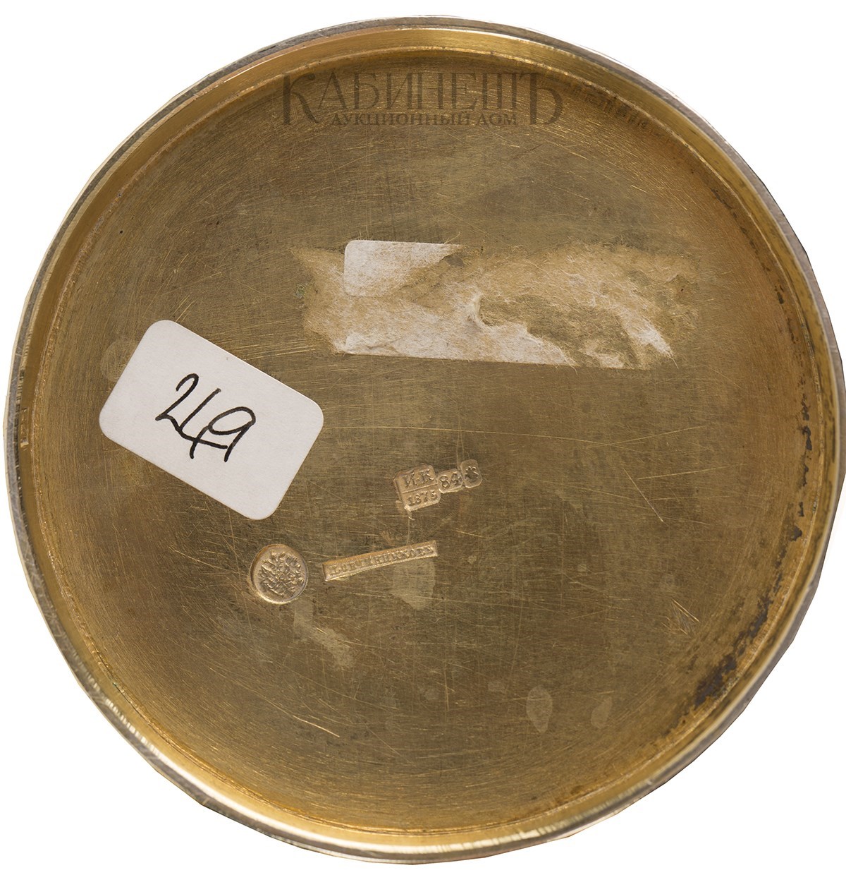 Клейма: на дне – пробирное «84» с гербом Москвы, клеймо пробирного мастера «ИК» над годом «1875», развернутое клеймо «Овчинниковъ» с императорским орлом, именник «ВС»; на ручке – пробирное «84».