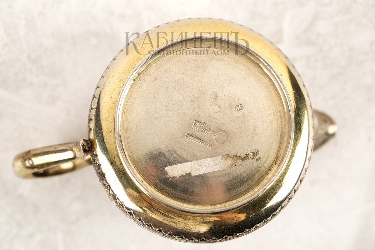Клейма: на дне – пробирное «84» с гербом Москвы, клеймо пробирного мастера «ИК» над годом «1875», развернутое клеймо «Овчинниковъ» с императорским орлом, именник «ВС»; на ручке – пробирное «84»; на крышке – именник «ВС».