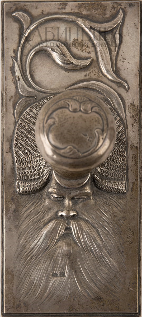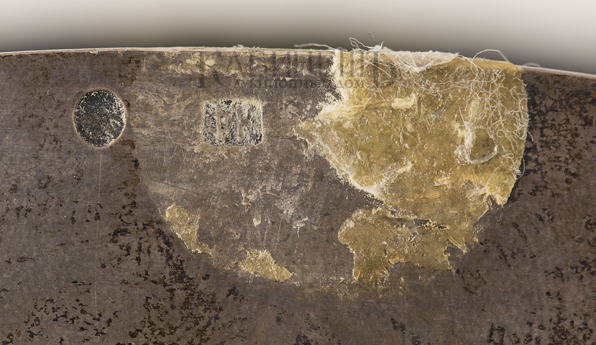 Клейма: пробирное «84» с женской головкой в кокошнике, повернутой влево, с инициалами пробирного инспектора «ЯЛ»,именник «ФК»; на ручке – пробирное «84» с женской головкой в кокошнике, повернутой влево, с инициалами пробирного инспектора «ЯЛ», именник «ФК»