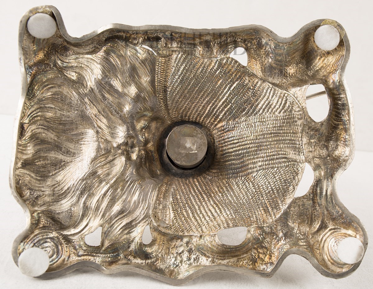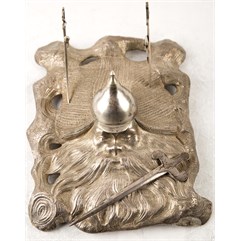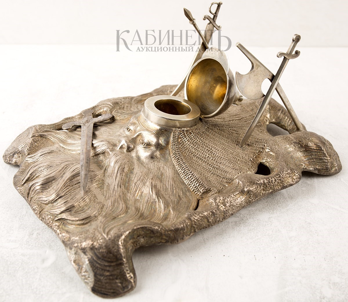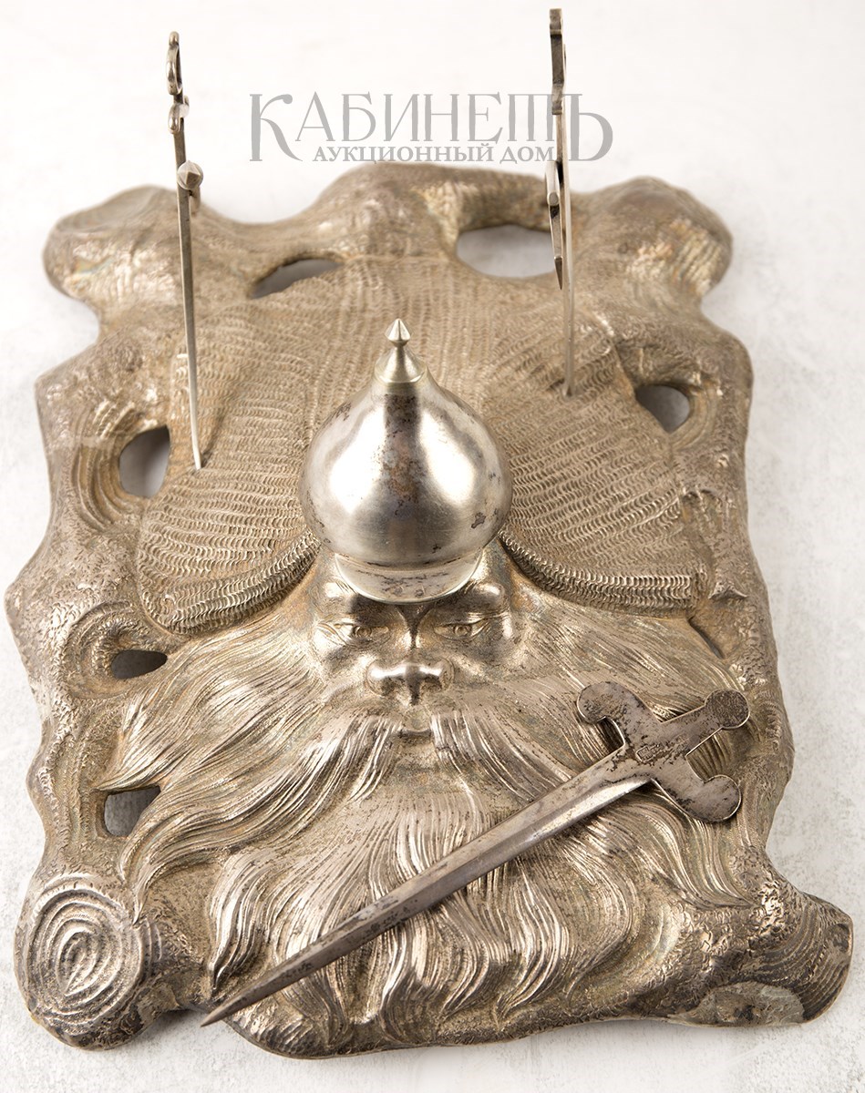 Клейма: на шлеме – пробирное «84» с женской головкой в кокошнике, повернутой влево, с инициалами пробирного инспектора «ЯЛ», именник «ФК»; внутри чернильницы – знак удостоверения, именник «ФК».