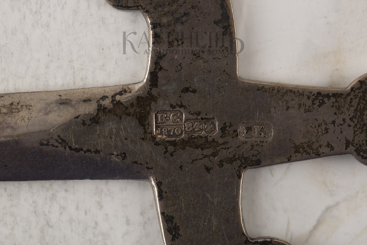 Клейма: пробирное «84» с гербом Санкт-Петербурга, клеймо пробирного мастера «В·С» на годом «1870», именник«Е.К».