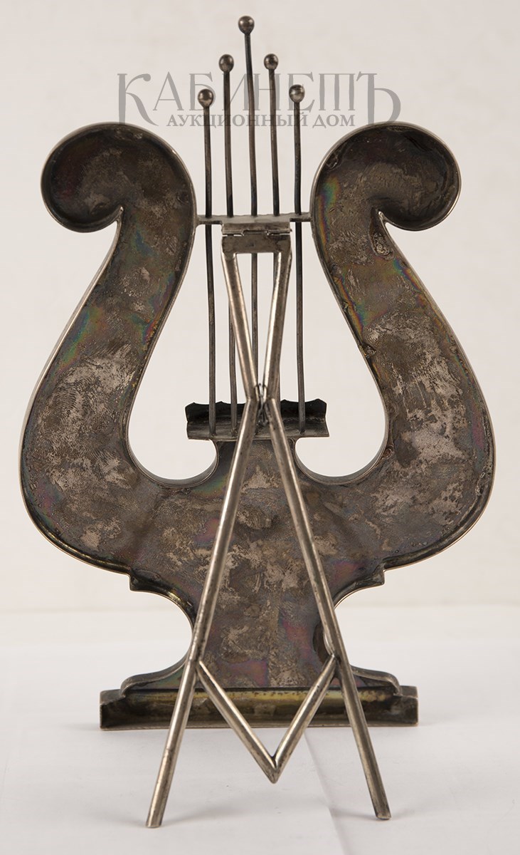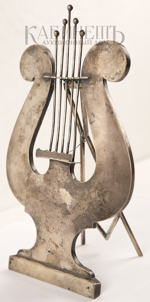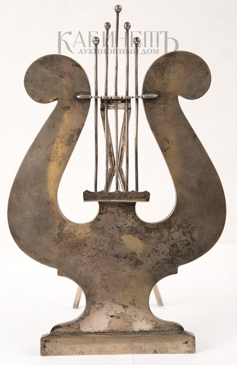 Клейма: на лицевой стороне – пробирное «84» с головой девушки в кокошнике, повернутой влево, именник «ИП»; на полочке – остатки пробирного клейма с инициалами пробирного инспектора «ЯЛ», именник «ИП»; на ножке – знак удостоверения, именник «ИП».