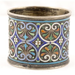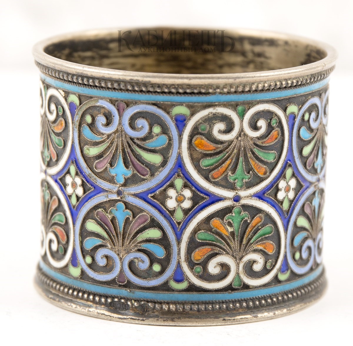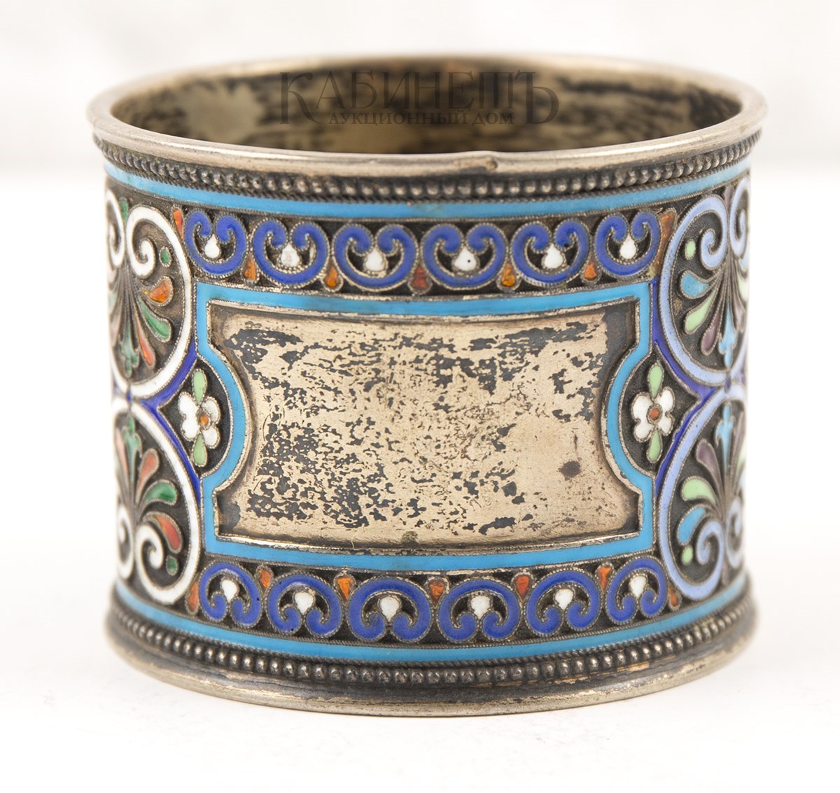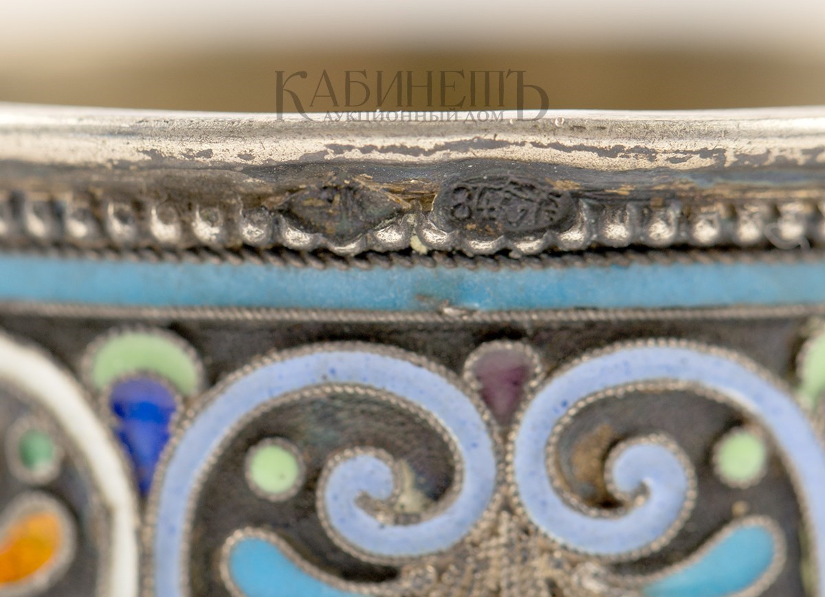 Клейма: на лицевой стороне на ободке вверху – пробирное «84» с женкской головкой в кокошнике, повернутой влево, с инициалами пробирного инспектора «ИЛ», именник «НК»в ромбовидном щитке.