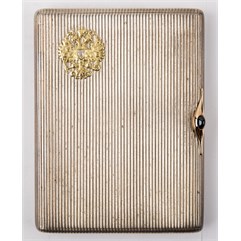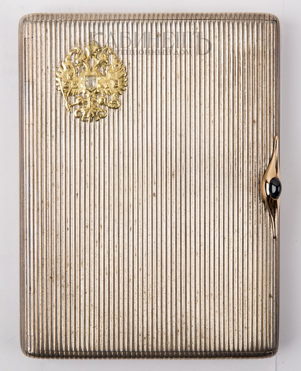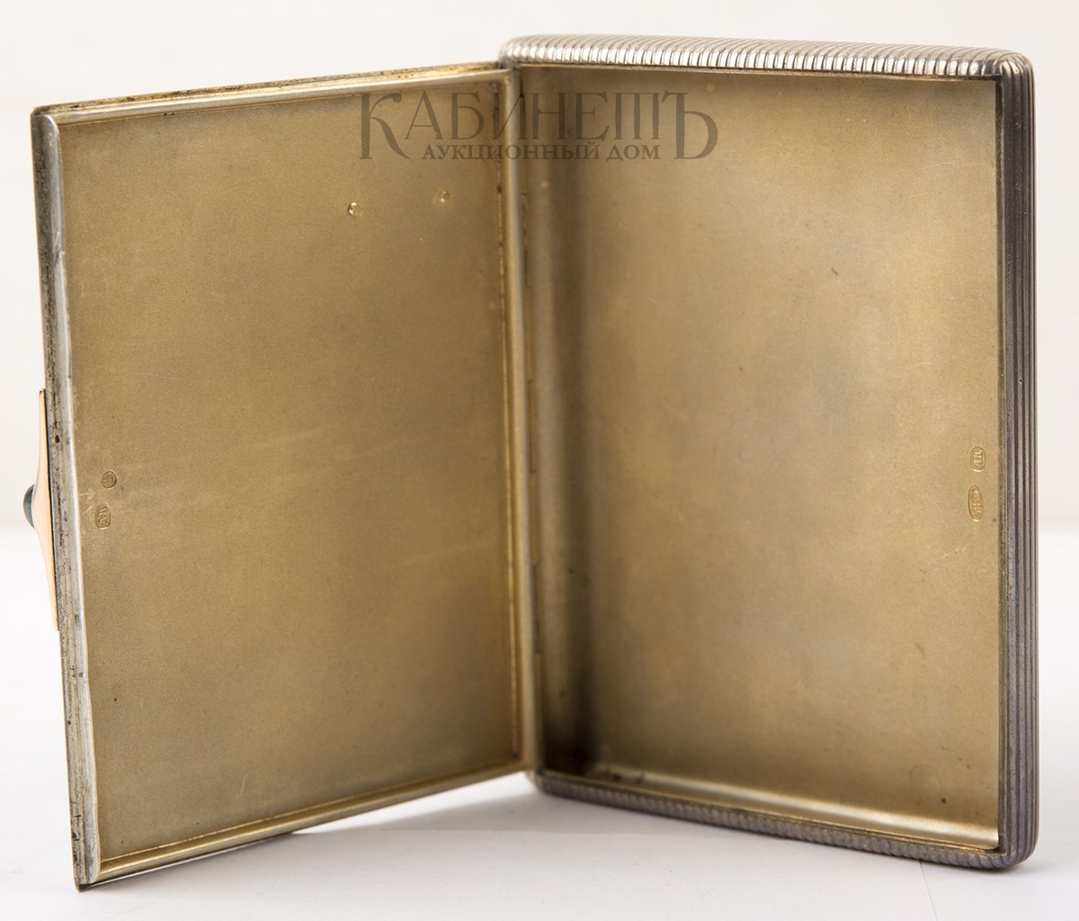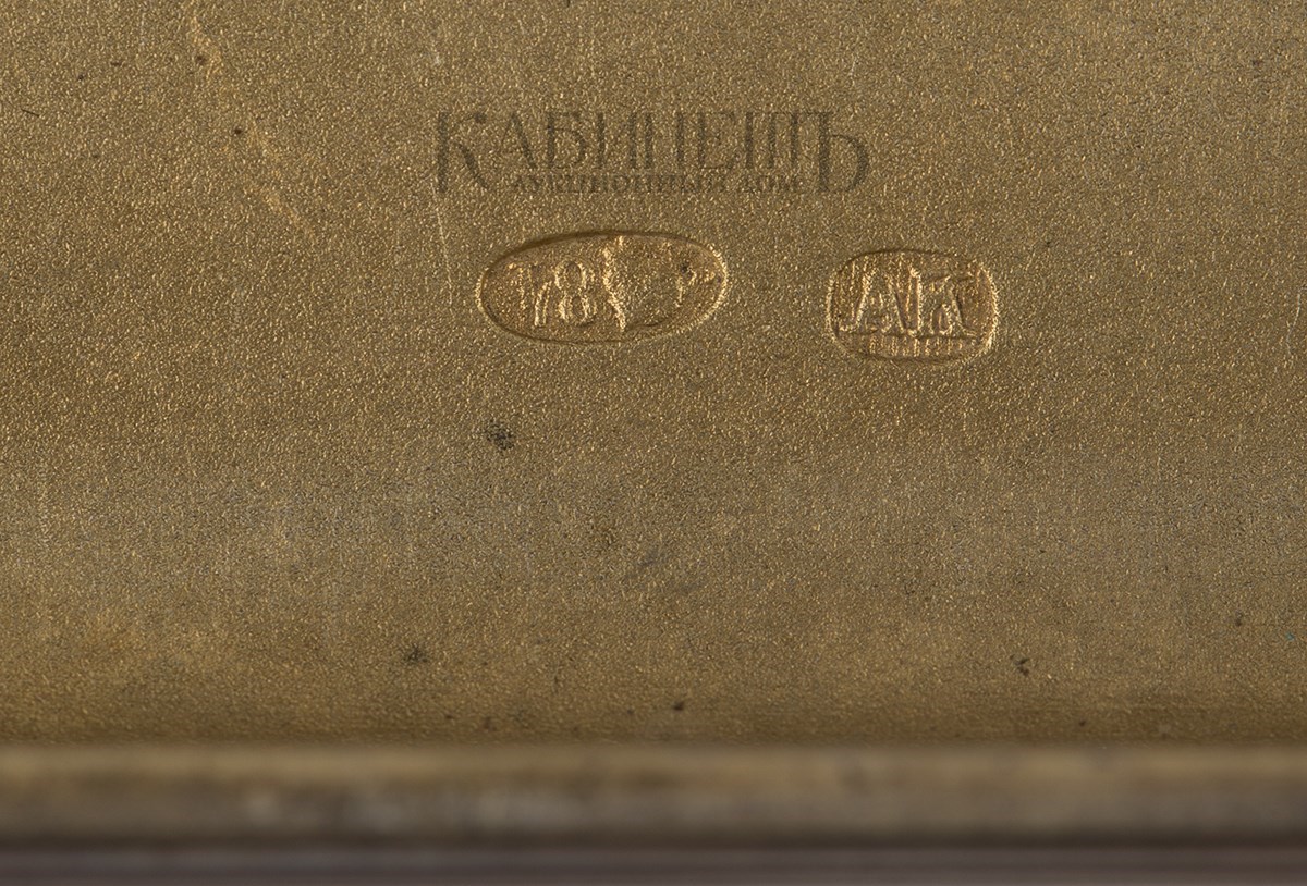 Клейма: на внутренней поверхности портсигара – пробирное «84» с женской головкой в кокошнике, повернутой вправо, с буквой «альфа», именник «АК»; на крышке с внутренней стороны – знак удостоверения, именник «АК».