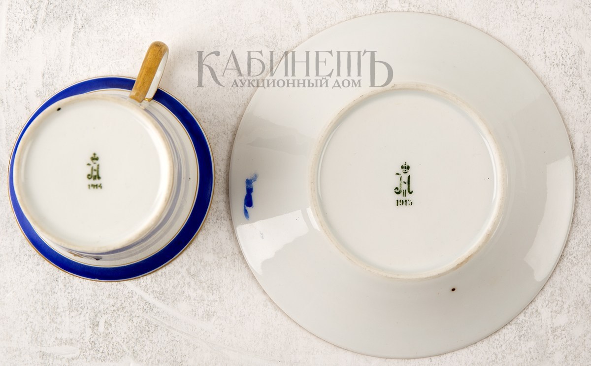 Марки: зеленая подглазурная марка Императорского фарфорового завода, с вензелем императора Николая II и датой «1914».