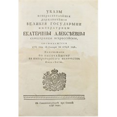 Указы Всепресветлейшей Державнейшей Великой Государыни Императрицы Екатерины Алексеевны Самодержицы Всероссийской, состоявшейся 1768 года с генваря по 1769-й год. Напечатаны по высочайшему ея императорского величества повиливаю. СПб.: Сенатская типография, 1786.
