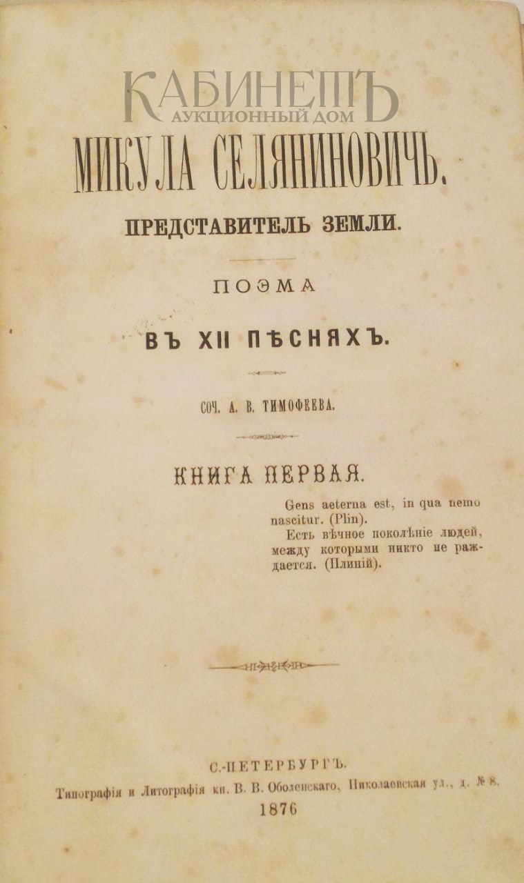 Тимофеев, А. Микула Селянинович, представитель земли. Поэма в XII песнях. В 2 кн. Кн. 1-2. СПб.: Типография и Литография кн. В.В. Оболенского, 1876.