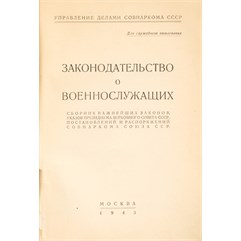 Архив аукциона №42 (113) [Издание времен Великой Отечественной войны] Законодательство о военнослужащих. Сборник военных законов, указов Президиума Верховного Совета СССР, постановлений и распоряжений Совнаркома Союза СССР. М.: Управление Делами Совнаркома СССР, 1943.