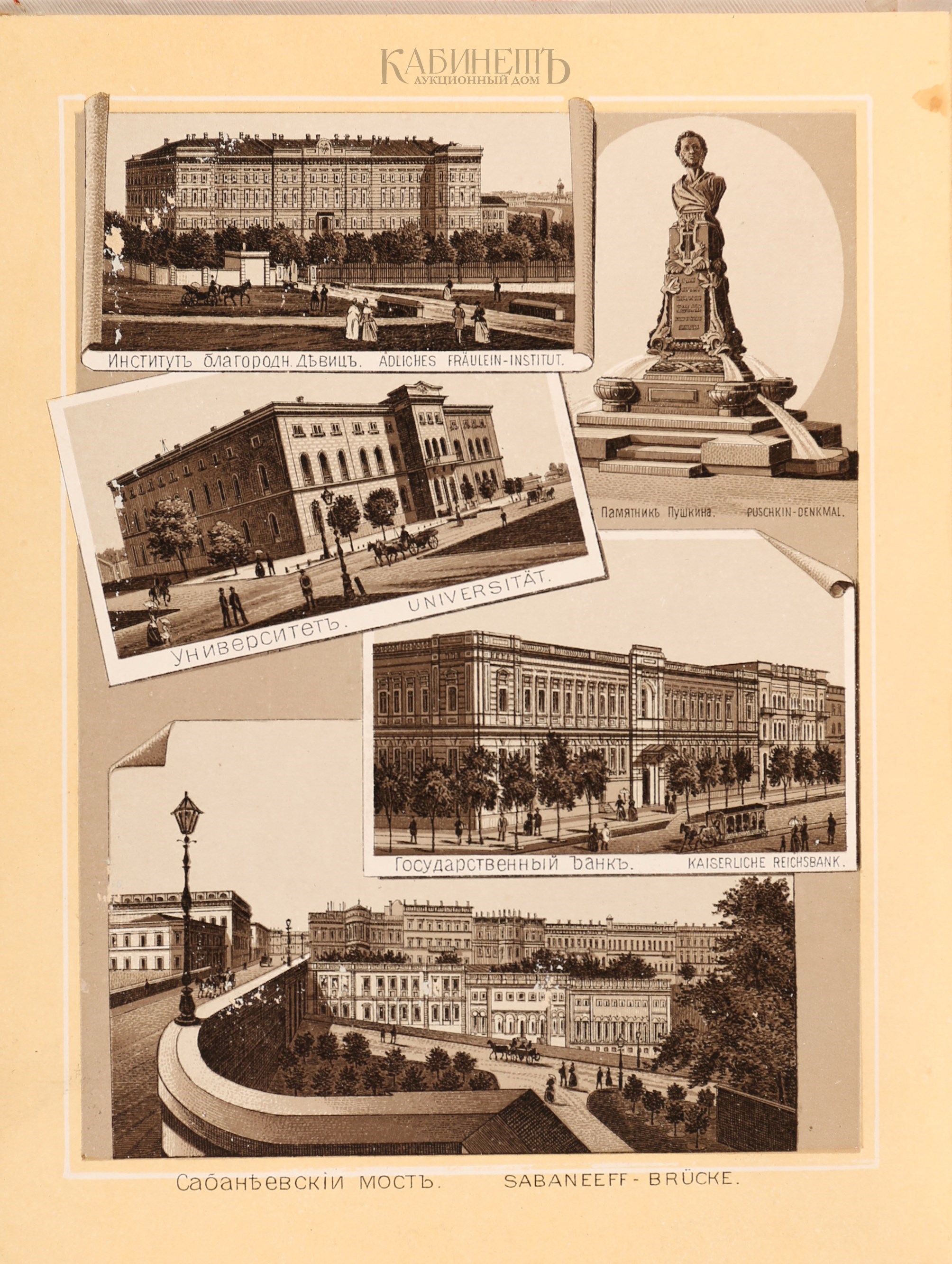 Книжка-раскладушка в издательской коленкоровой папке с конгревным тиснением и золотым тиснением. Внутренняя сторона папки обклеена бумагой под муар. Подписи к литографиям на русском и немецком языках. Незначительные потертости папки.