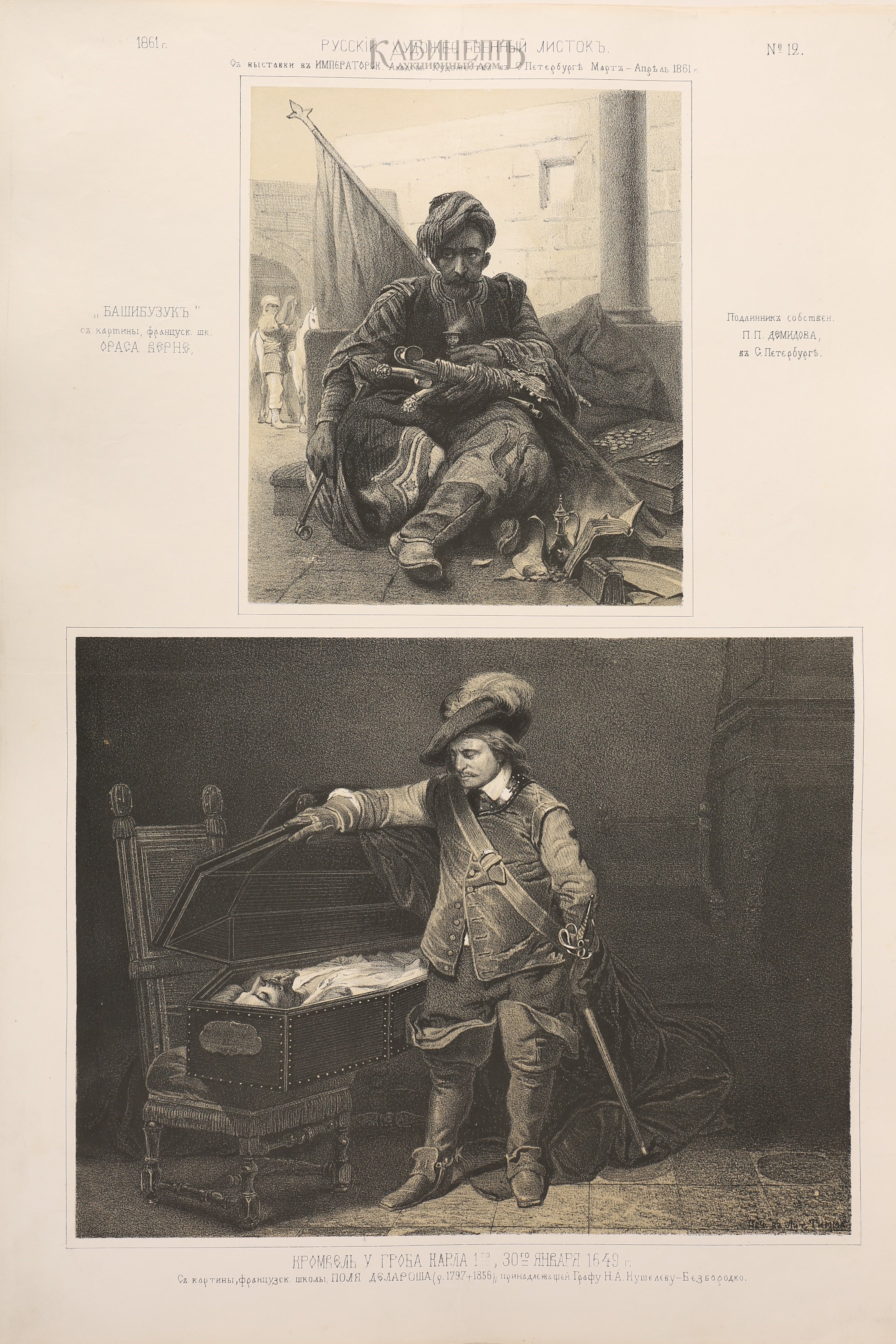 Русский художественный лист № 9 за 1861 г. Тимм Василий Федорович (1820 –1895). С выставки в Императорской Академ. Художеств в Санкт-Петербурге март-апрель 1861 г. Башибузук. Кромвель у гроба Карла 1. [СПб.]: Литография В. Тимма, 1861.