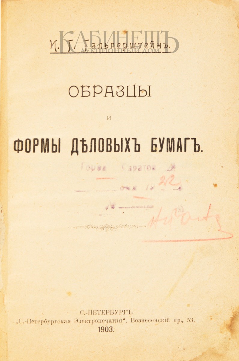 1. Гальперштейн, И.Г. Образцы и формы деловых бумаг. СПб.: С.-Петербургская электропечатня, 1903. 216 с.