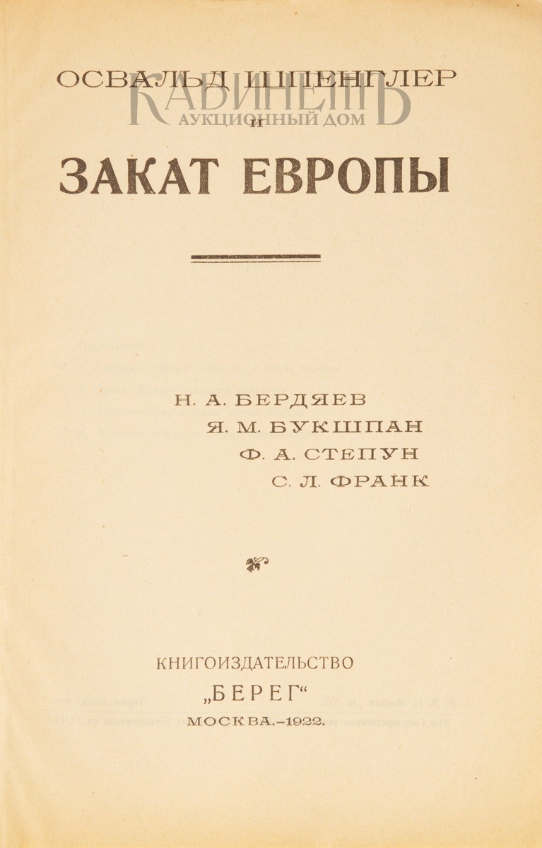 Сборник статей о еще не вышедшей в России на тот момент книге немецкого философа О. Шпенглера «Закат Европы» (первое русское издание датируется 1923 г.)