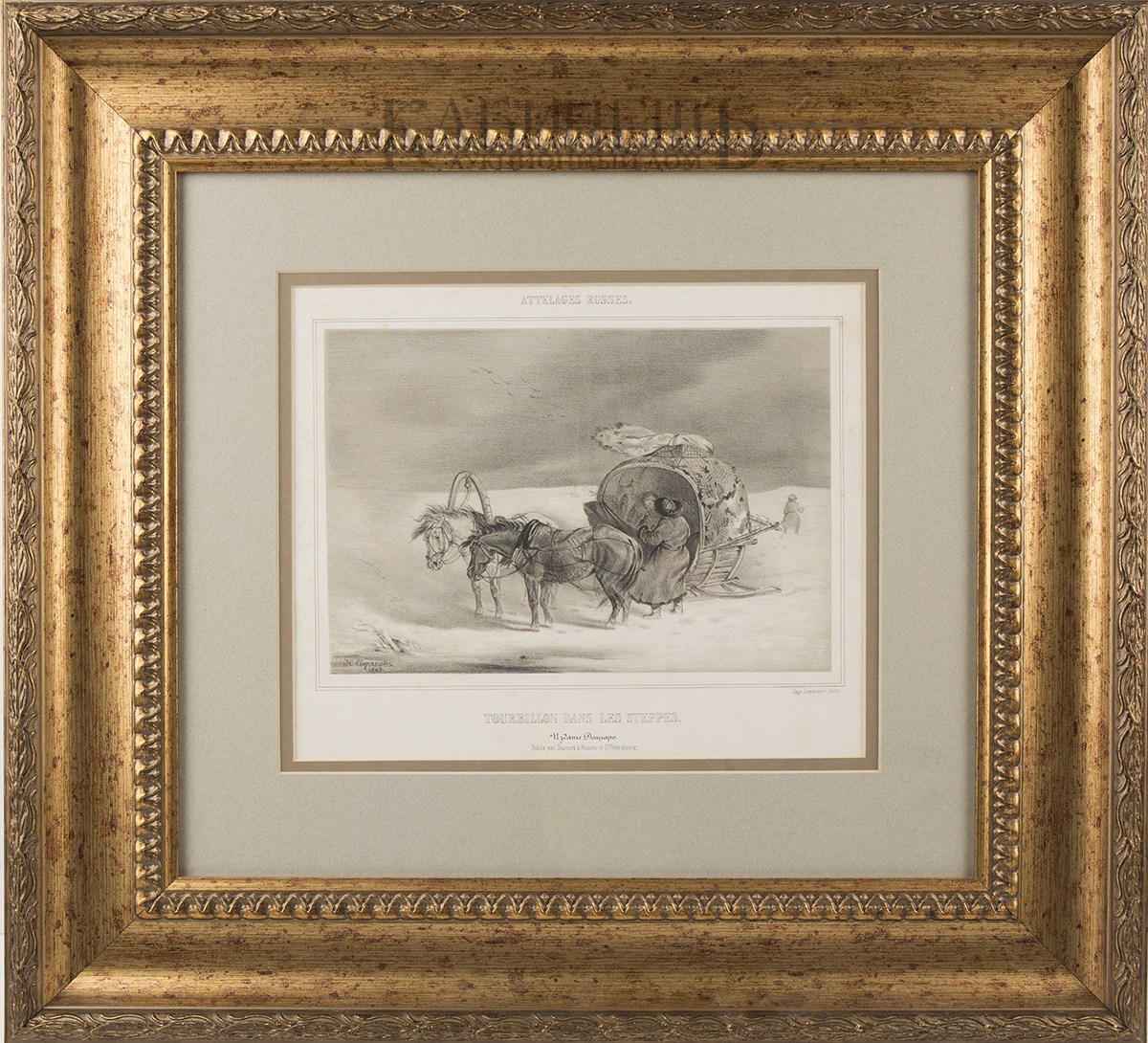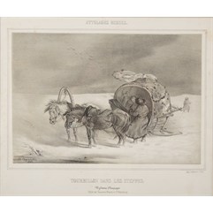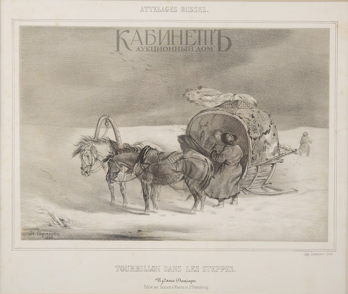 Слева внизу на изображении надпись: «Н. Сверчковъ/ 1847». Над изображением надпись: «Attelages Russes», под изображением надпись: «Tourbillon dans les steppes./ Изданiе Дациаро./ Publié par Daziaro à Moscou et St Pétersbourg.». Cправа под изображением надпись: «Imp Lemercier Paris».