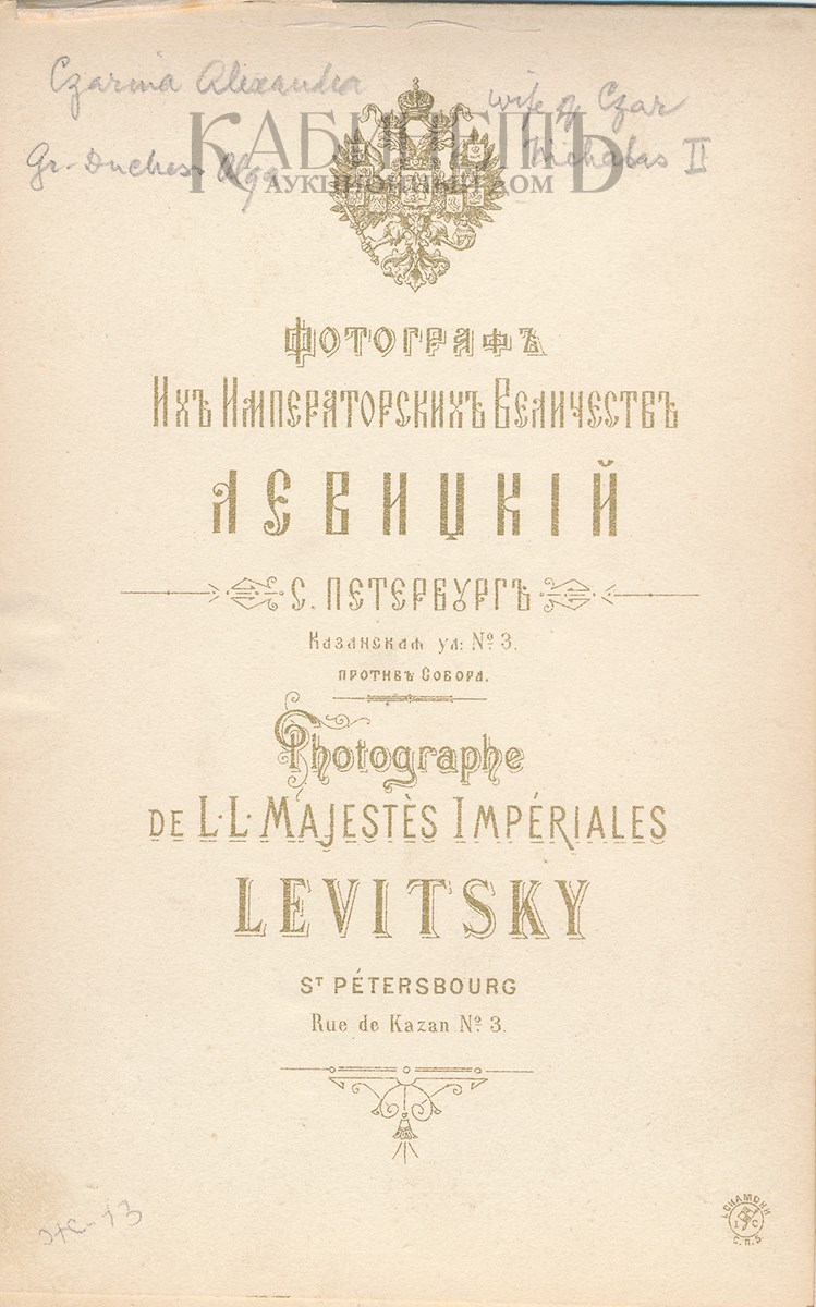 Фирменное паспарту фотографа Их Императорских Величеств Левицкого. На лицевой стороне – штамп – факсимильная подпись «Левицкiй»