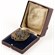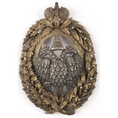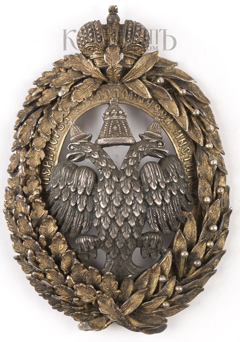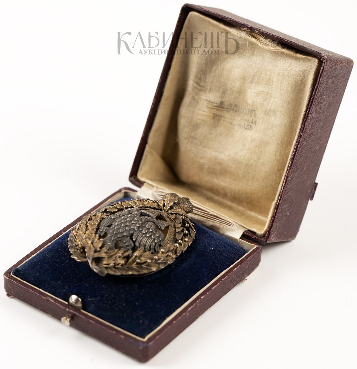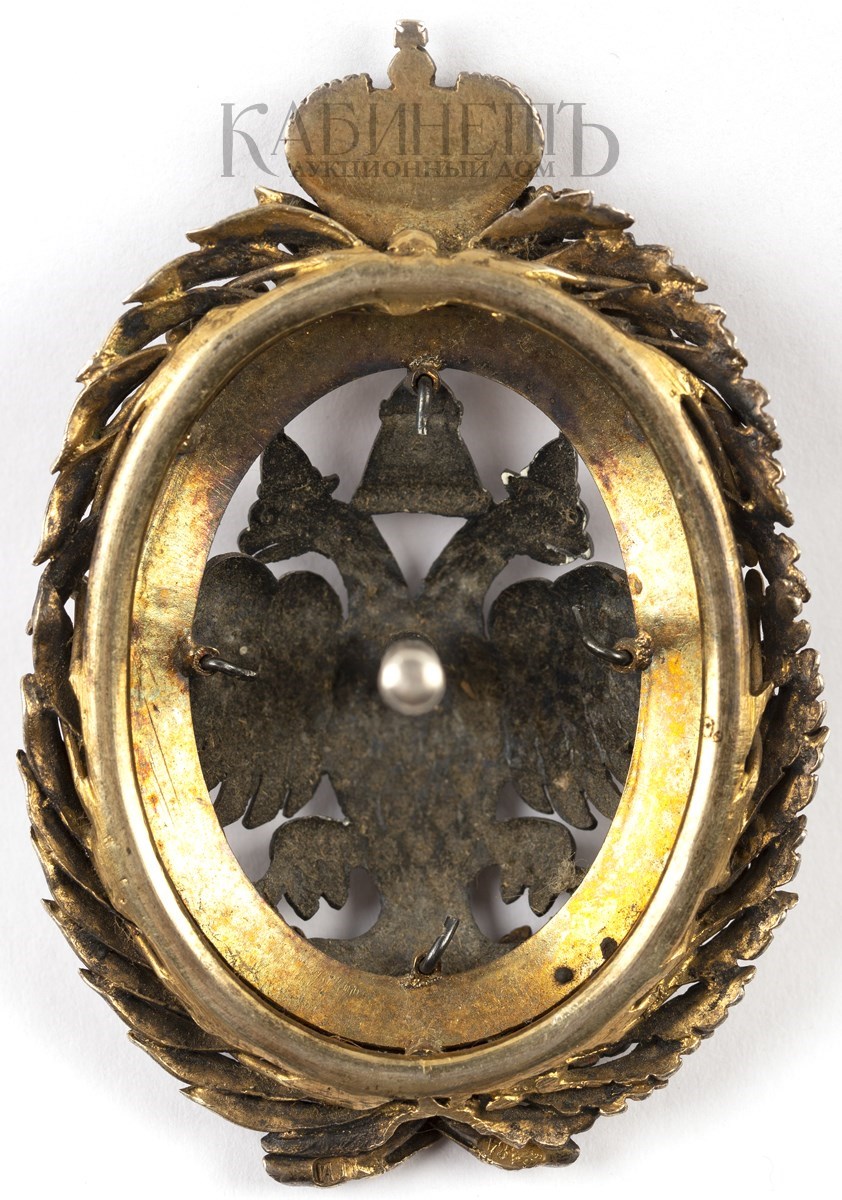Клейма: на оборотной стороне на лентах венка – пробирное «84» с женской головкой в кокошнике, повернутой вправо, с буквой «альфа», именник «ИП»; на прижимной шайбе и закрутке знак удостоверения.
