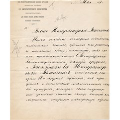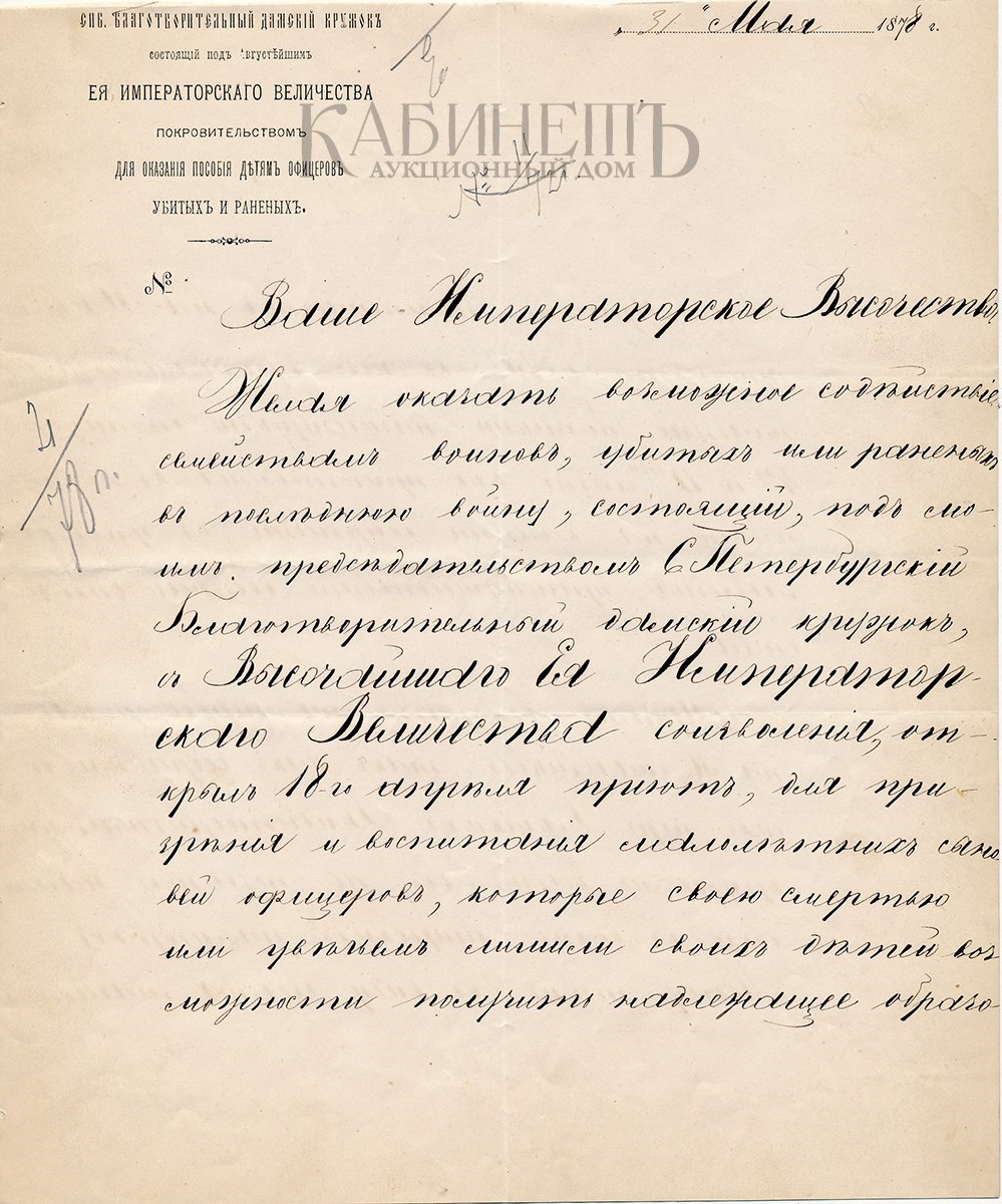 Архив аукциона №41(104) Письмо от Председательницы Санкт-Петербургского Благотворительного Дамского кружка, состоящего под Августейшим Ее Императорского Величества покровительством для оказания пособия детям офицеров убитых и раненых.