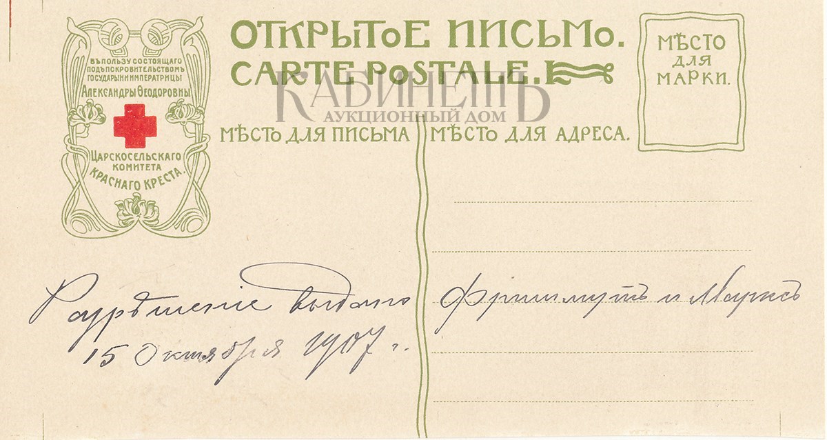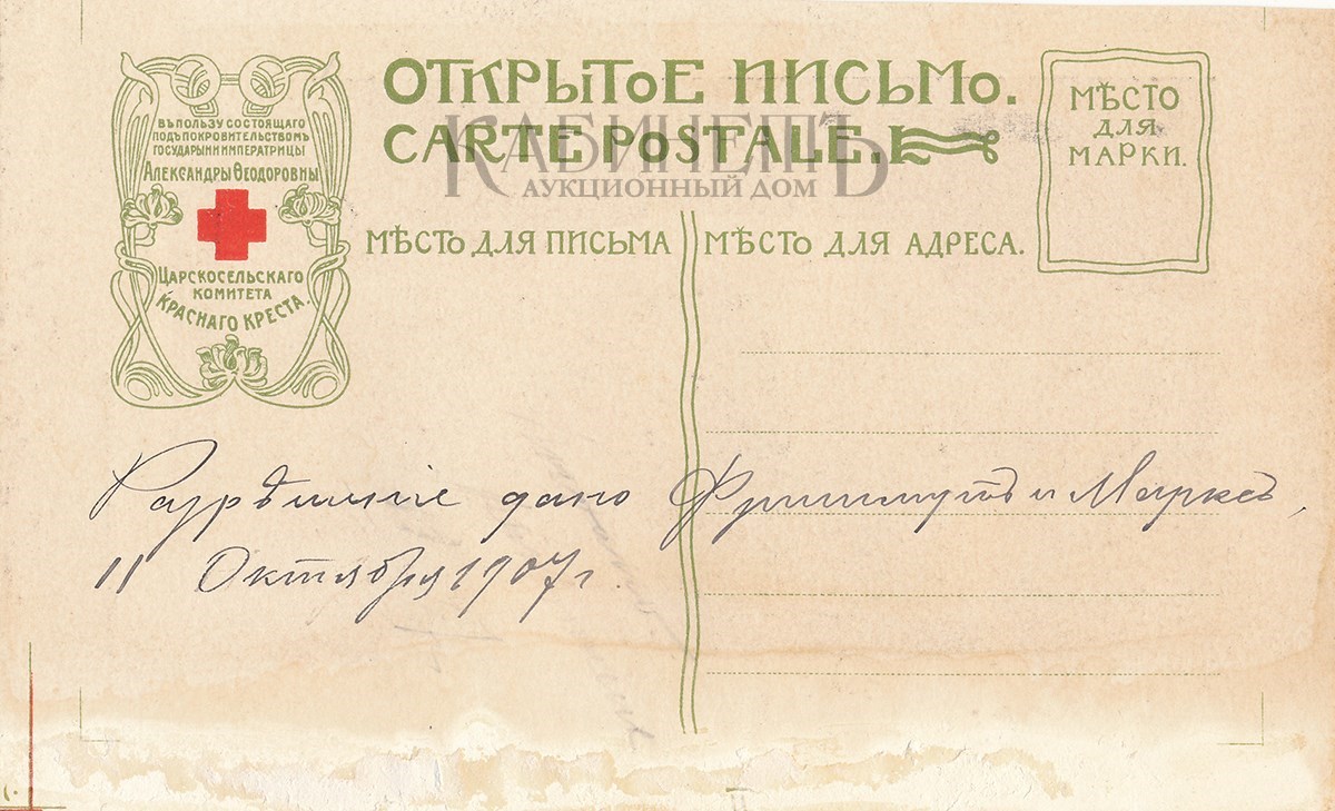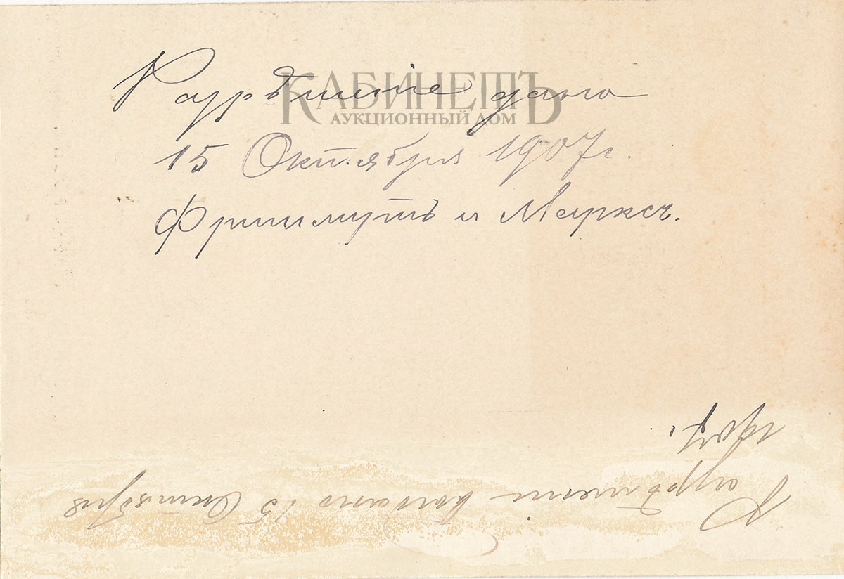 На обороте надписи чернилами: «Разрешение дано 15 октября 1907 г. Фришмут и Маркс» и «Разрешение выдано 15 октября 1907 г.»