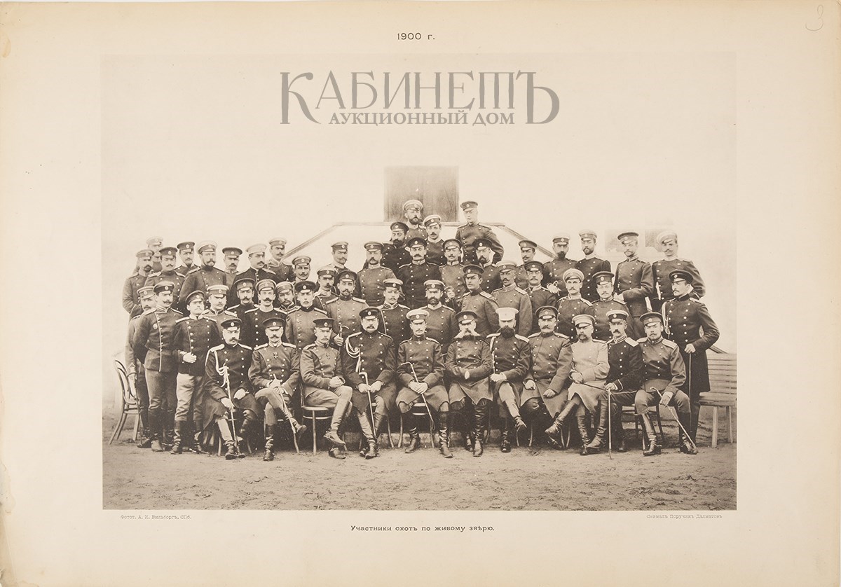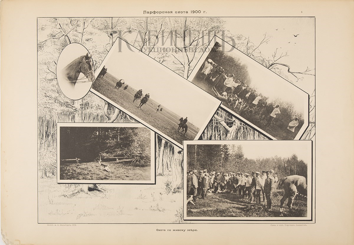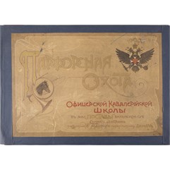 Альбом–папка; фототипии на отдельных листах. Содержание. Виды местечка «Поставы»; охота верхом на лошадях с собаками по искусственному следу; охота на живого зверя; скачки по пересечённой местности, преодоление препятствий; окончание охоты; разделка туши оленя; охота на волка с борзыми собаками; трофей охоты: туша убитого лося. Групповые снимки участников охоты-офицеров кавалерийской школы.