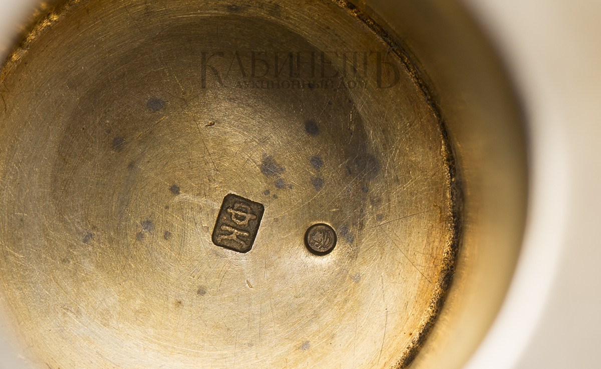 Клейма: пробирное «84» с женской головкой в кокошнике, повернутой влево, с инициалами пробирного инспектора «ЯЛ», именник «ФК»; на ручке – пробирное «84» с женской головкой в кокошнике, повернутой влево, с инициалами пробирного инспектора «ЯЛ», именник «ФК»