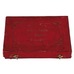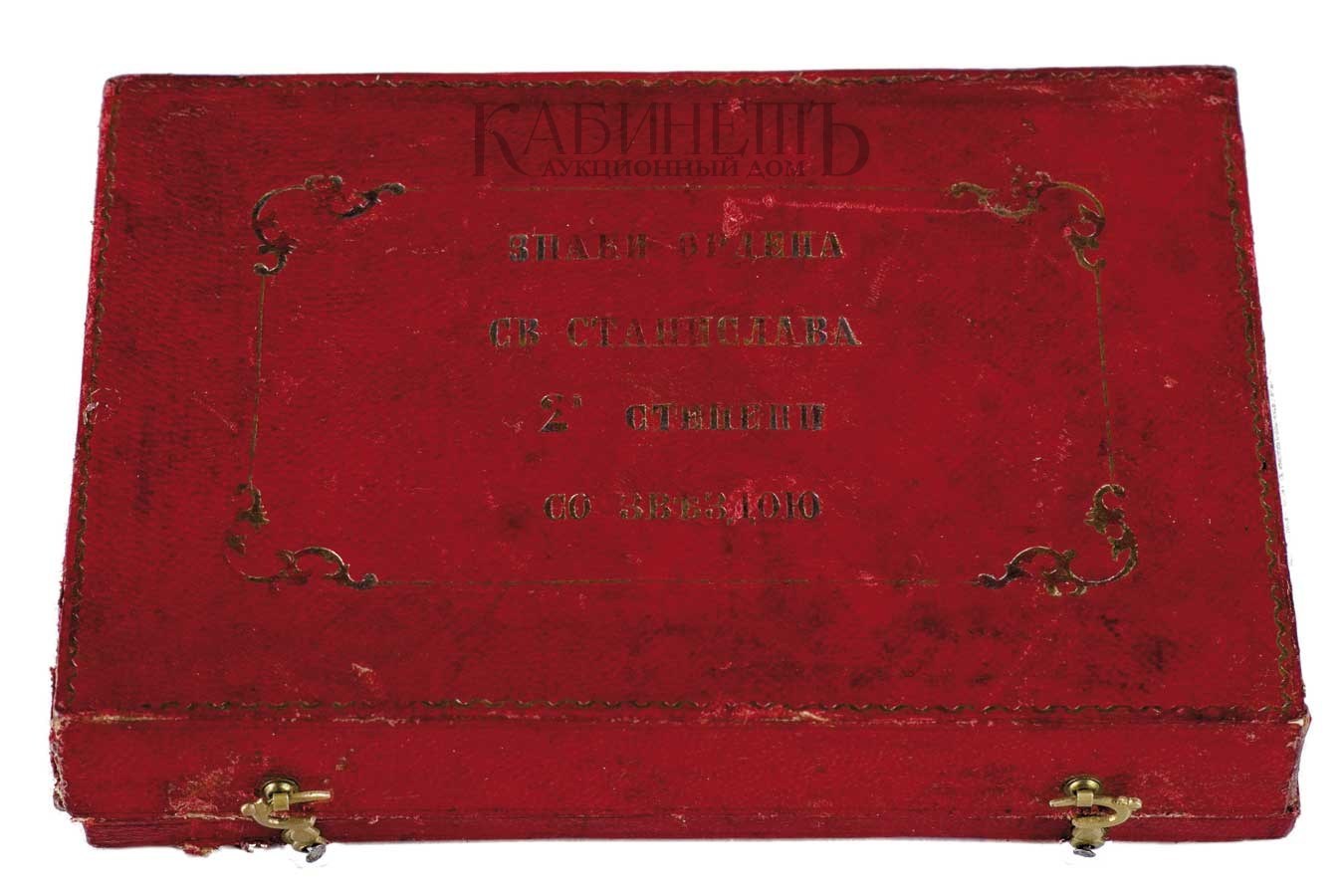 На верхней крышке в три строки надпись золотым тиснением: «Знаки ордена/ СВ. СТАНИСЛАВА/ 2й степени/ СО ЗВЕЗДОЮ».
