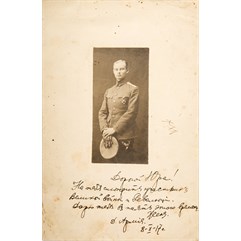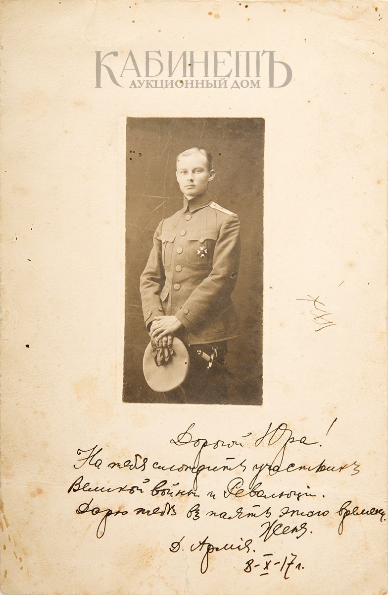 На паспарту дарственная надпись: «Дорогой Юра! / На тебя смотритъ участникъ / Великой войны и Революцiи. / Дарю тебъ въ память этого времени/ Женя./ Д. Армiя. / 8- X – 17 г.»