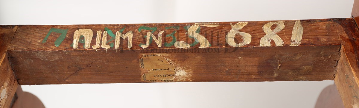 На царгах стульев присутствуют наклейка и инвентарные номера Петергофского дворца-музея: «Управление Петергофскими дворцами-музеями № 596», «633», «ПД: У № 44», «ПД: У № 733». «ПДМ № 5681», а также фрагмент дореволюционной наклейки: «....офскаго /правленiя»