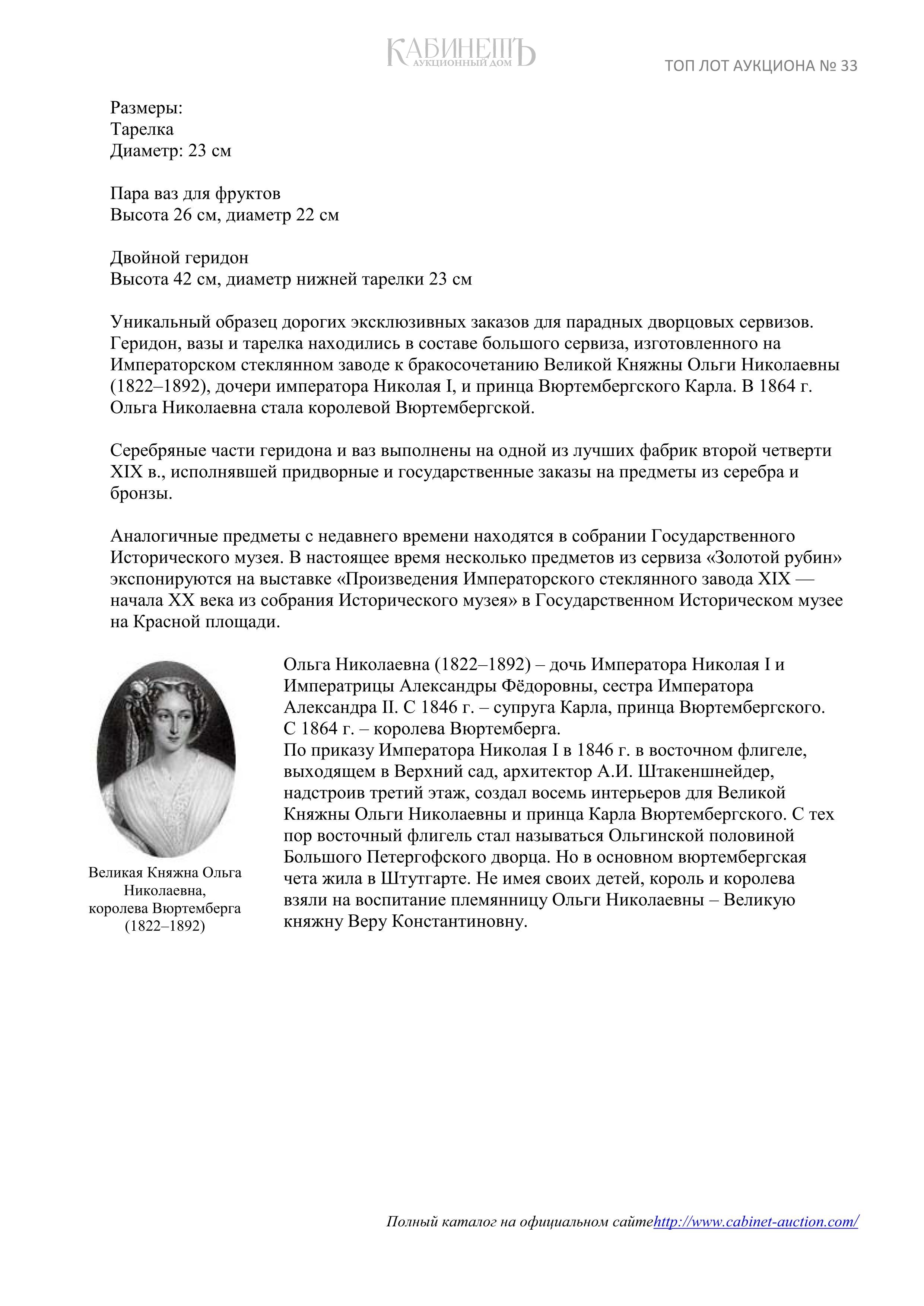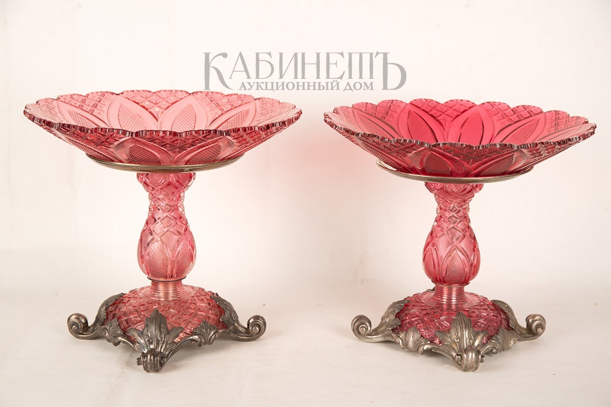 Уникальный образец дорогих эксклюзивных заказов для парадных дворцовых сервизов. Вазы находились в составе большого сервиза, изготовленного на Императорском стеклянном заводе к бракосочетанию Великой Княжны Ольги Николаевны (1822–1892), дочери императора Николая I. и принца Вюртембергского Карла. В 1864 г. Ольга Николаевна стала королевой Вюртембергской.