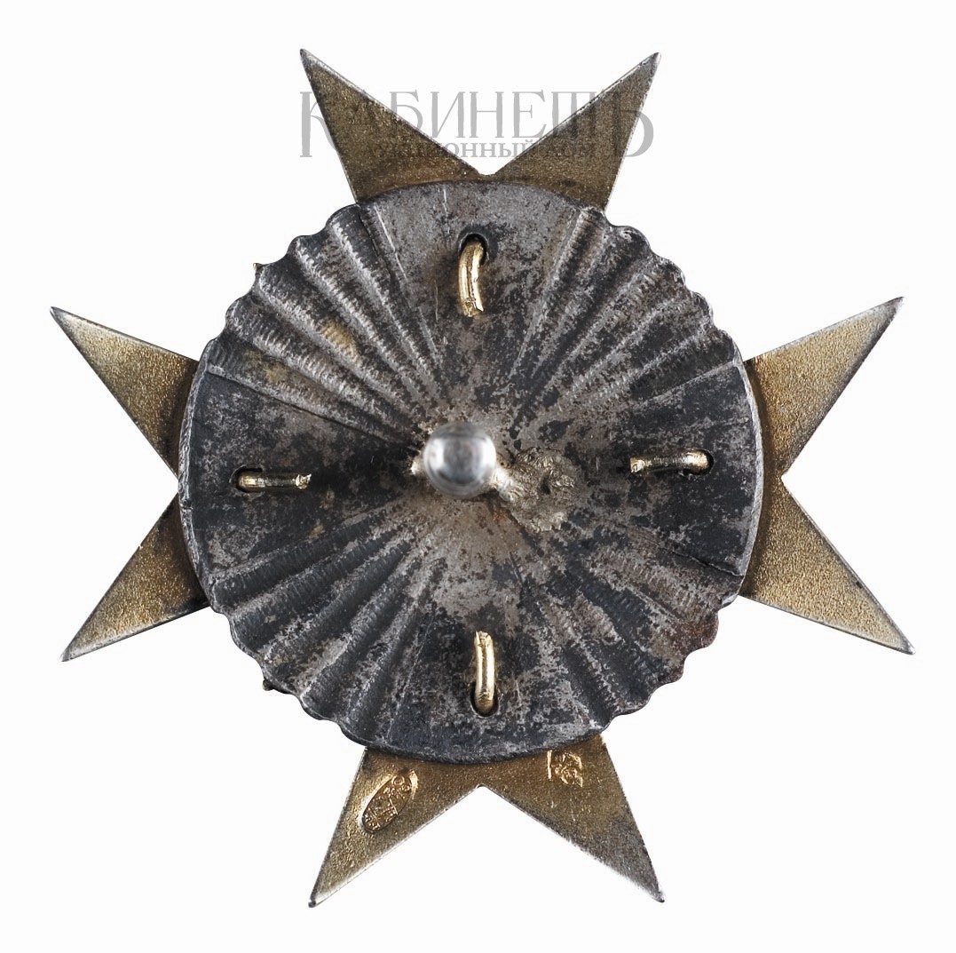 Клейма: на оборотной стороне знака – Санкт-Петербургского окружного пробирного управления с пробой металла и инициалами управляющего пробирным округом Я. Н. Ляпунова («84», женская головка в кокошнике, влево, «ЯЛ») в овальном щитке; именное клеймо «ЭК» в прямоугольном щитке. На шайбе – знак удостоверения (женская головка в кокошнике, вправо, в круглом щитке).