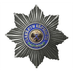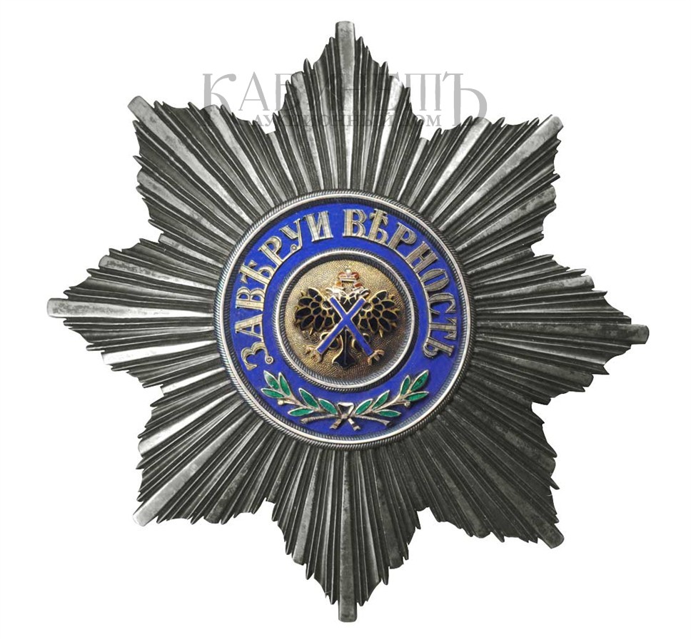 Клейма: на оборотной стороне звезды – 84-й пробы в прямоугольном щитке, герб Санкт-Петербурга, именное клеймо «WN»; на заколке – герб Санкт-Петербурга, именное клеймо «WN».