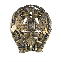 Клейма: на оборотной стороне на лентах венка – пробирное «56» с женской головкой в кокошнике, повернутой влево, с инициалами пробирного инспектора Санкт-Петербургского пробирного округа «ЯЛ» (Якова Ляпунова), именник «АБ»; на шайбе – именник «АБ», знак удостоверения; на гайке – именник «АБ», знак удостоверения.