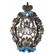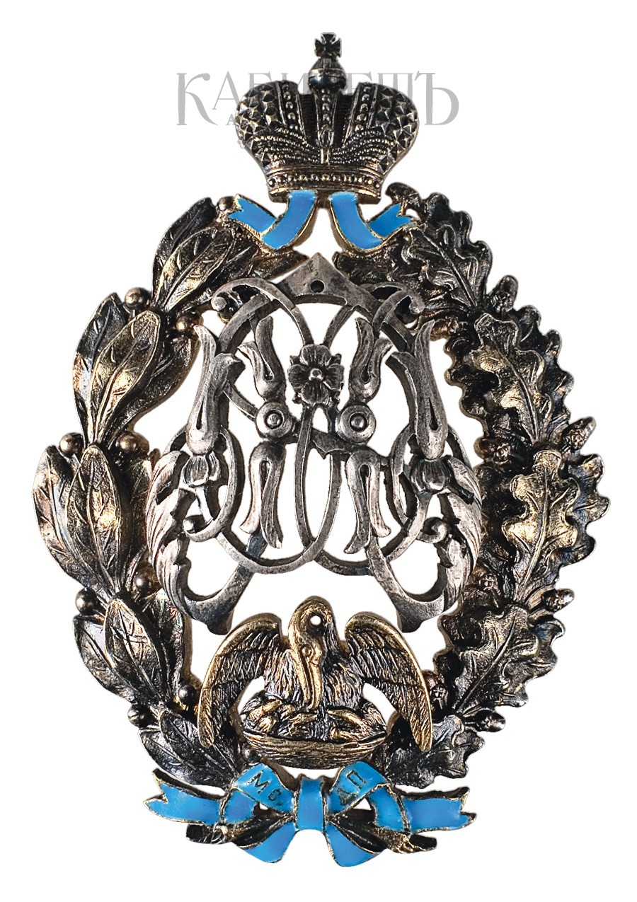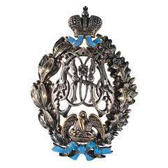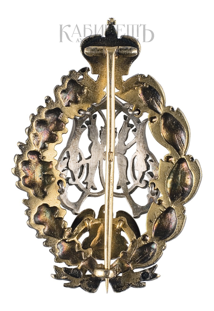 Клейма: на оборотной стороне знака на лентах венка – пробирное «84» с женской головкой в кокошнике, повернутой вправо, с буквой «альфа», именник «АТ».
