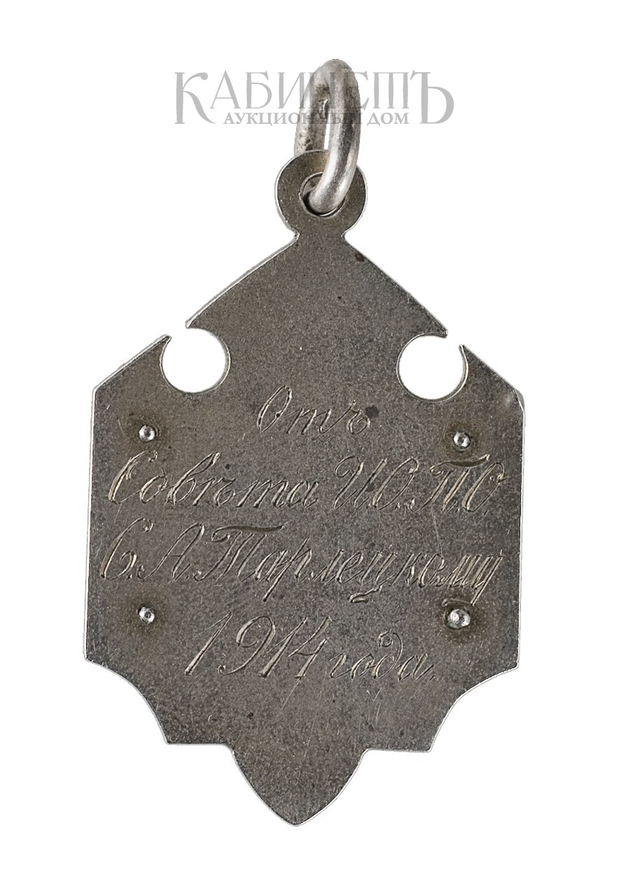 На оборотной стороне жетона гравированная надпись в четыре строки: «Отъ / Совета И.О.П.О/ С. А. Тарлецкому/ 1914 года.»