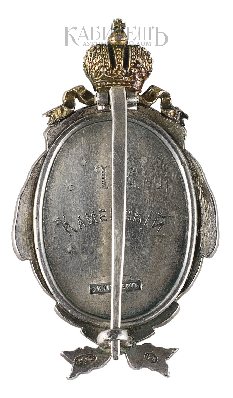 Клейма: на оборотной стороне на лентах венка – пробирное «84» с женской головкой в кокошнике, повернутой влево, с инициалами пробирноего инспектора Санкт-Петербургского пробирного округа «ЯЛ» (Яков Ляпунов), именник «E•S»; на оборотной стороне знака – развернутое клеймо «Э. К. Шубертъ» На оборотной стороне гравированная надпись: «I. B. Каменскiй».