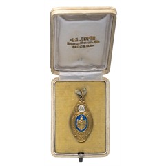 Жетон в оригинальном футляре. На внутренней стороне крышки футляра надпись в три строки: «Ф.А.ЛОРIЕ /Кузнецкiй мостъ/№4/МОСКВА.»
